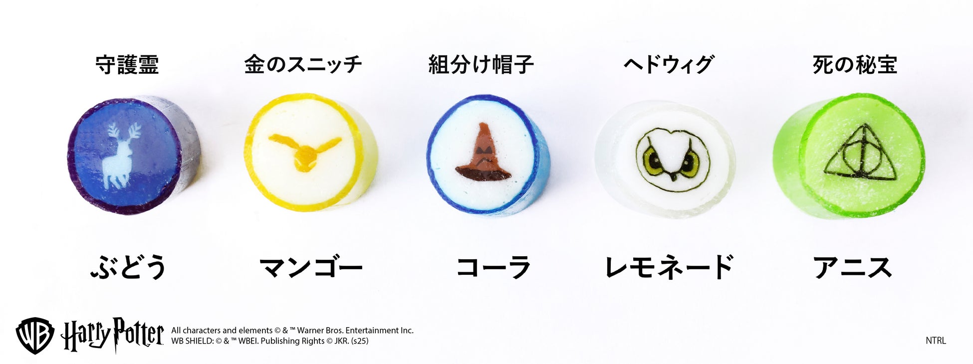 ホグワーツの4つの寮をイメージした、カラフルなキャンディミックス。それぞれの寮を象徴するカラー(赤・青・緑・黄)と、アルファベット(G・R・S・H)をデザインしました。寮ごとの個性をイメージに合わせたフレーバーで、遊び心あふれる味わいをお楽しみいただけます。ひと粒が小さく食べやすいサイズで、見た目も楽しいキャンディです。