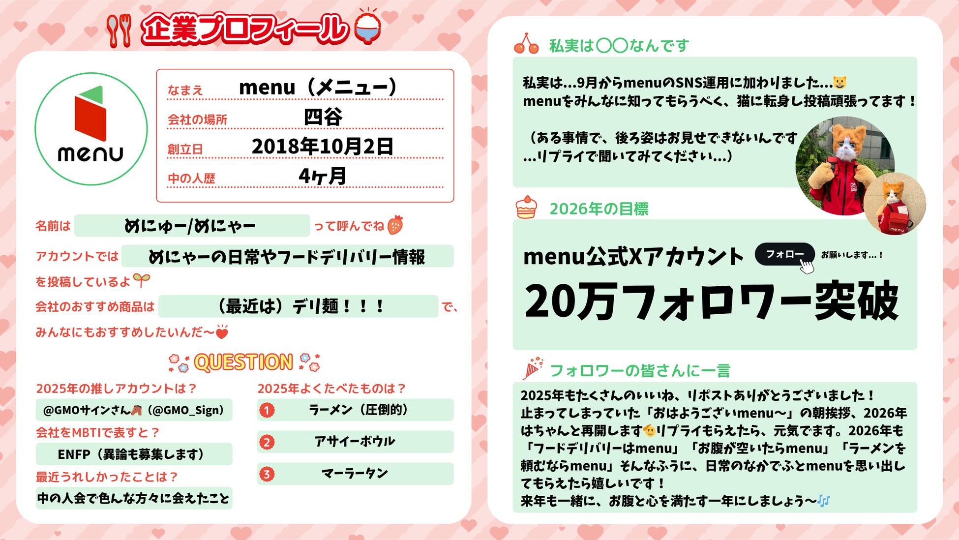 menu株式会社(本社:東京都新宿区、代表取締役:信田篤男)が運営するデリバリーアプリ「menu」は、SNS運用担当者(以下、「中の人」)がプロフィール帳形式のテンプレートで一年を振り返る参加型企画「中の人年末総決算2025」を、2025年12月15日(月)〜12月19日(金)の5日間で実施します。