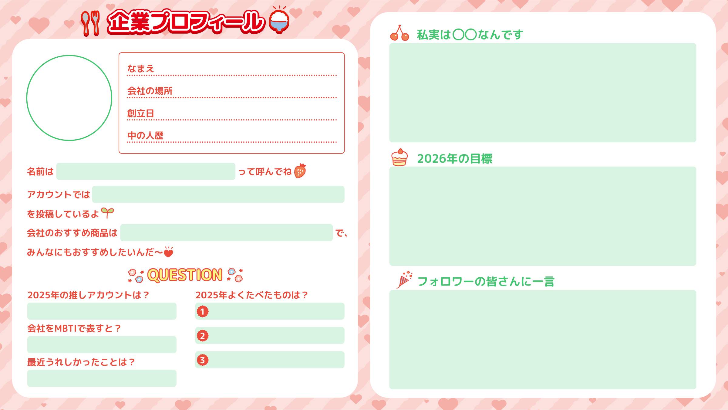 年末に中の人がX上で「2025年の総決算」を共有する参加型企画です。プロフィール帳デザインのオリジナルテンプレートに各項目を記入し、自身が運用する企業公式Xアカウントから投稿することで、誰でも気軽に参加できます。