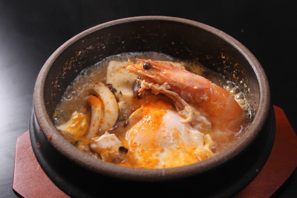 海老、イカ、あさりで取った魚介の旨味と唐辛子スープをベースにした辛味が人気の韓国鍋です。貝出汁を加えてあり濃厚な魚介の旨味と豆腐の食感を楽しむ事が出来ます。