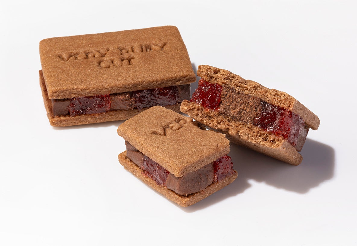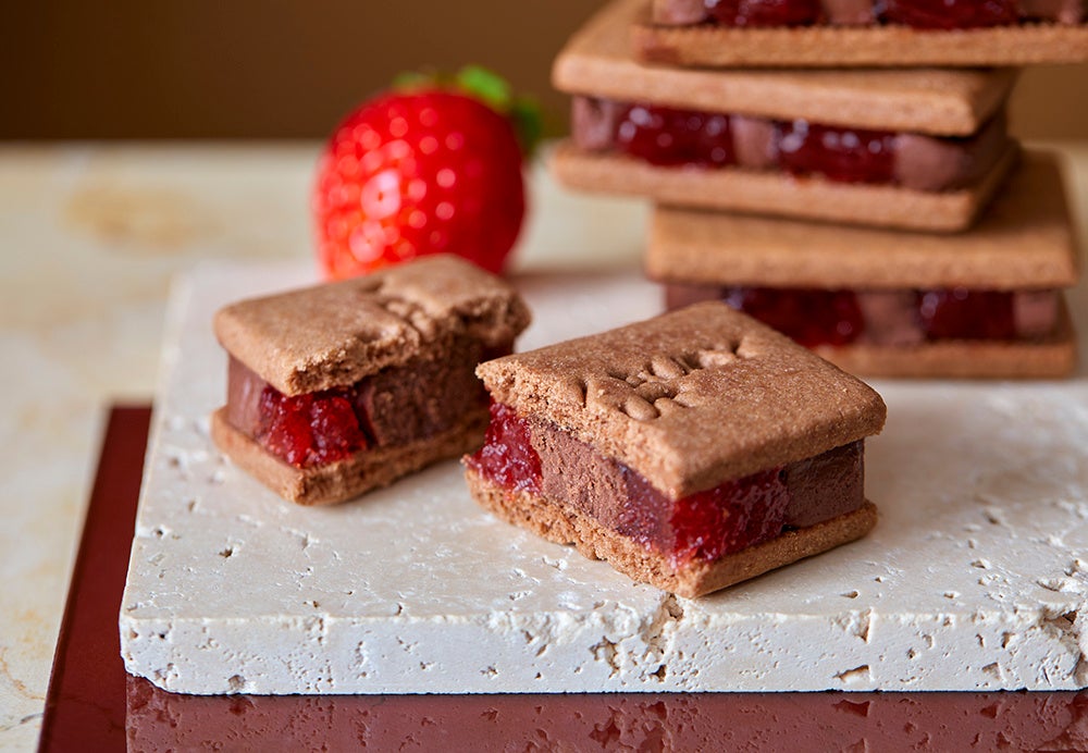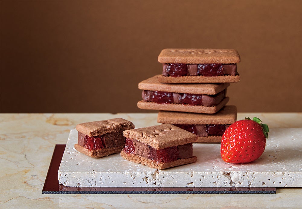 真っ赤な果肉と香り高い甘さが特徴の「イタリア産サブリナ苺」をとろっと煮詰めたコンフィチュールに、薫るカカオのコクが濃厚にとろけだす芳醇ショコラ。ふたつが柔らかなまま合わさった“とろけるダブルメルト製法”の⽣み出す⾄福の美味しさを、ココア⾵味のしっとりクッキーでサンドしました。