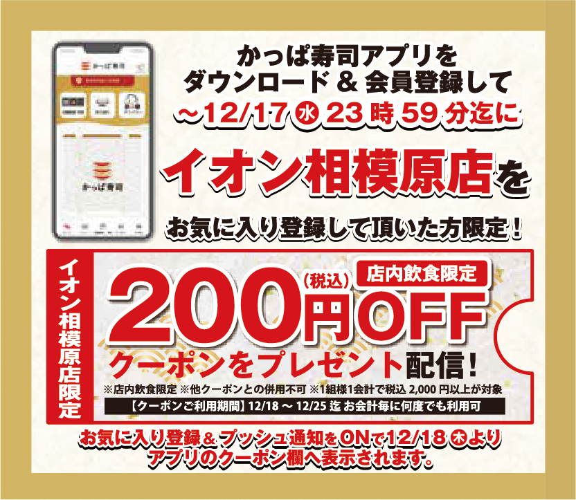 かっぱ寿司公式アプリをダウンロード&会員登録いただき、12月17日(水)23時59分までに「かっぱ寿司 イオン相模原店」をお気に入り登録いただくと、12月18日(金)から12月25日(木)まで、お会計毎に何度でもご利用いただける“店内飲食限定200円(税込)OFFクーポン”をプレゼント配信いたします。