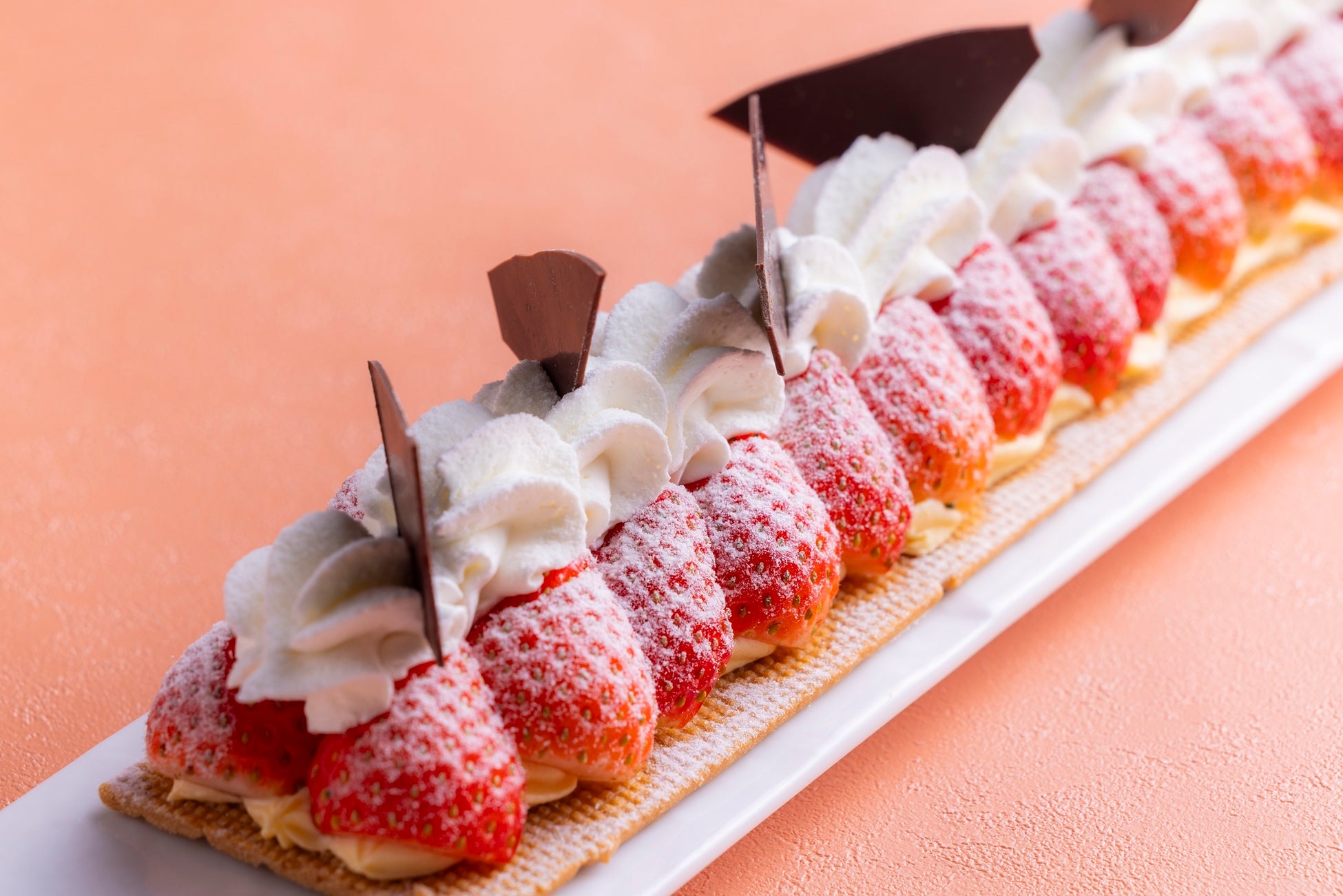 スイーツでひと際目を引くカラフルな「いちごのトゥンカロン」は、フレッシュいちごを挟んでおり、その可愛らしさは写真映え間違いなし。サクサクのクッキー生地にたっぷりのいちごを乗せた「ロングストロベリータルト」は、口いっぱいに広がるいちごを味わっていただけます。さらに、ライブステーションで仕上げる「いちごカスタードの絞りたてパイシュークリーム(ランチ限定)」は、美味しさだけではなく、オーダーしてから出来上がるまでのワクワク感も楽しみの一つです。