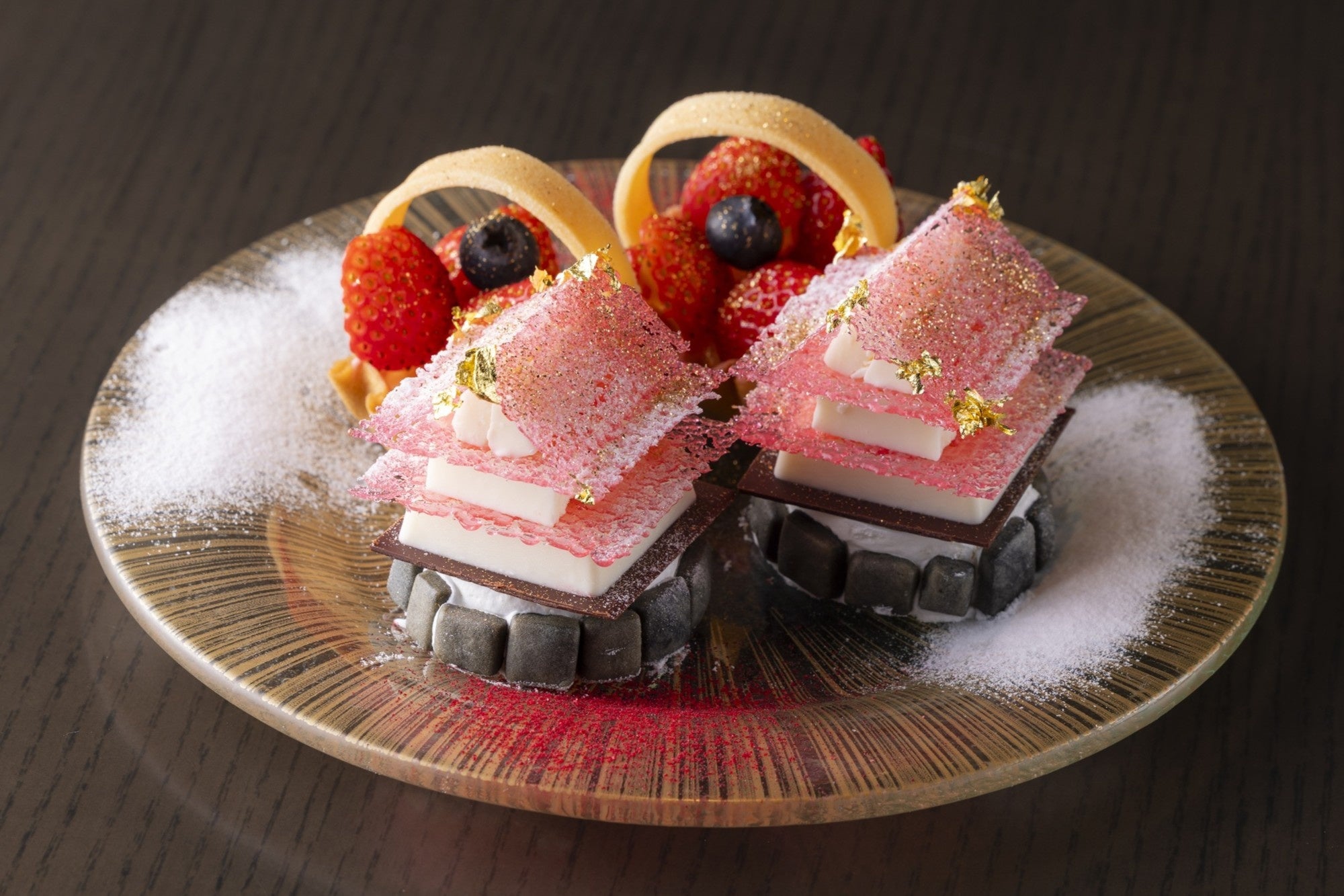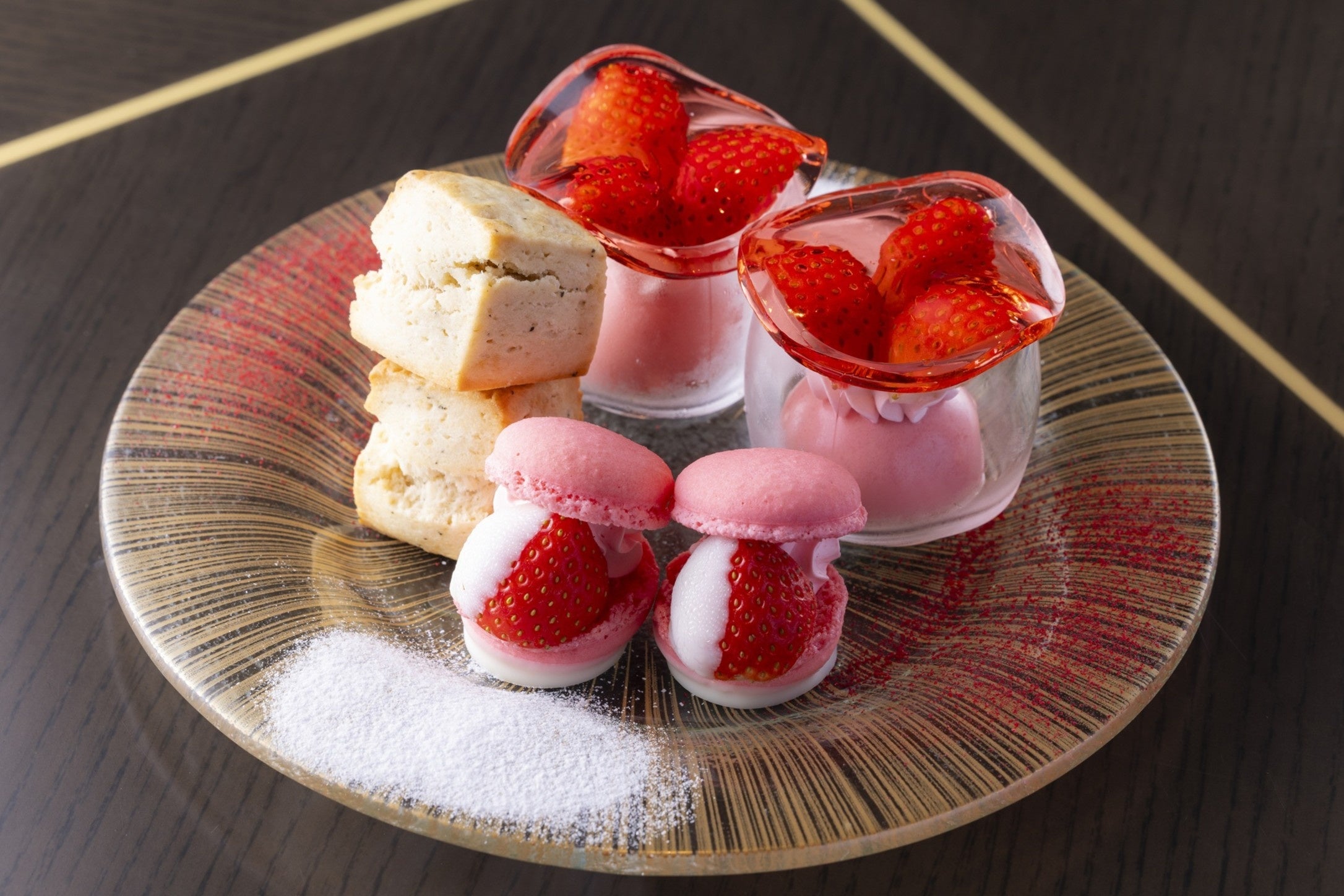 お城をイメージした人気のショートケーキが、ストロベリーシーズンを盛り上げるピンクバージョンに。石垣を模したクッキーでさらにパワーアップしました。他にも、透明ないちごゼリーがグラスの上で煌めく可愛らしいストロベリーレアチーズケーキなど、この時期ならではのいちごづくしのアフタヌーンティーをお楽しみください。