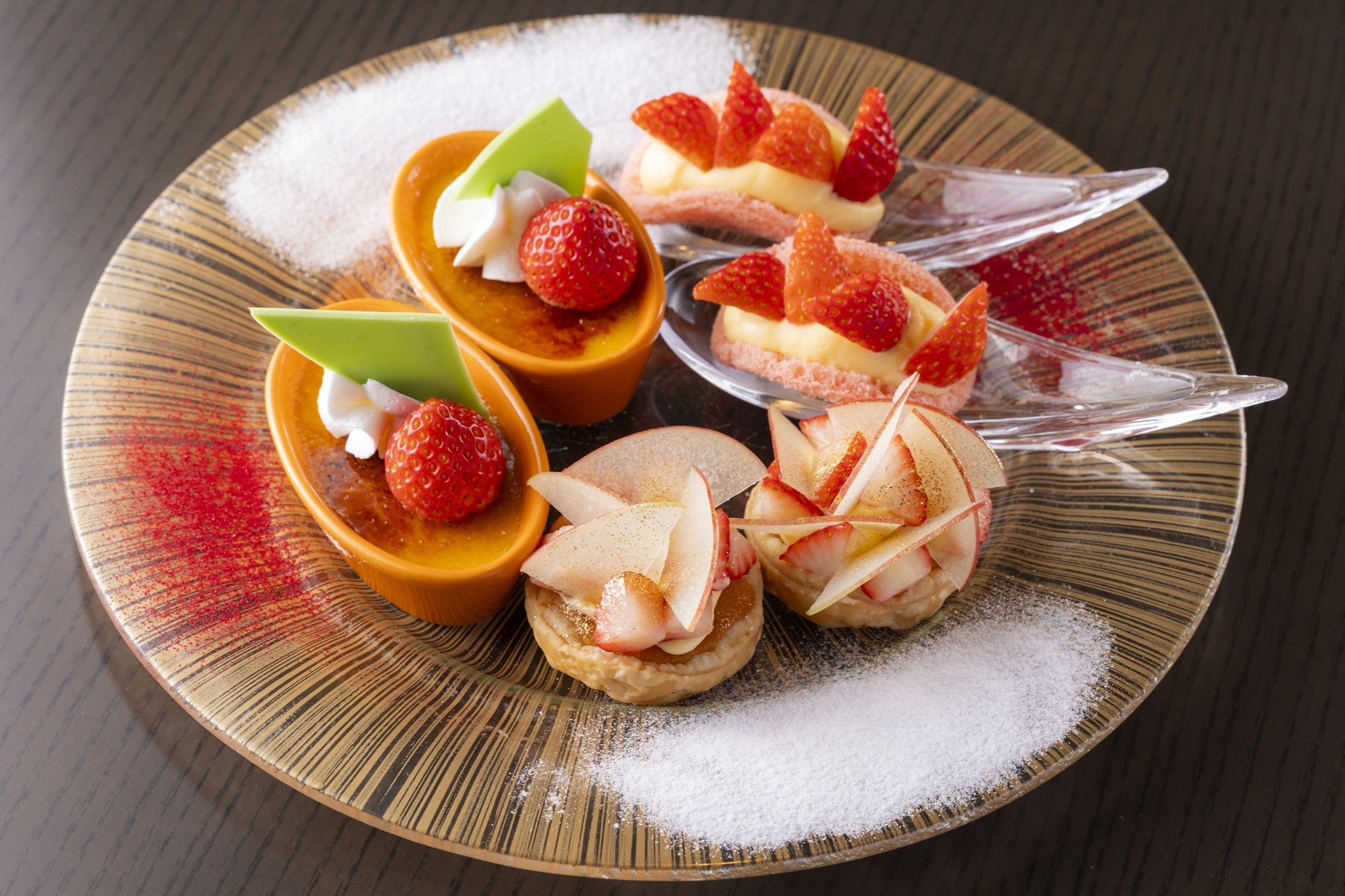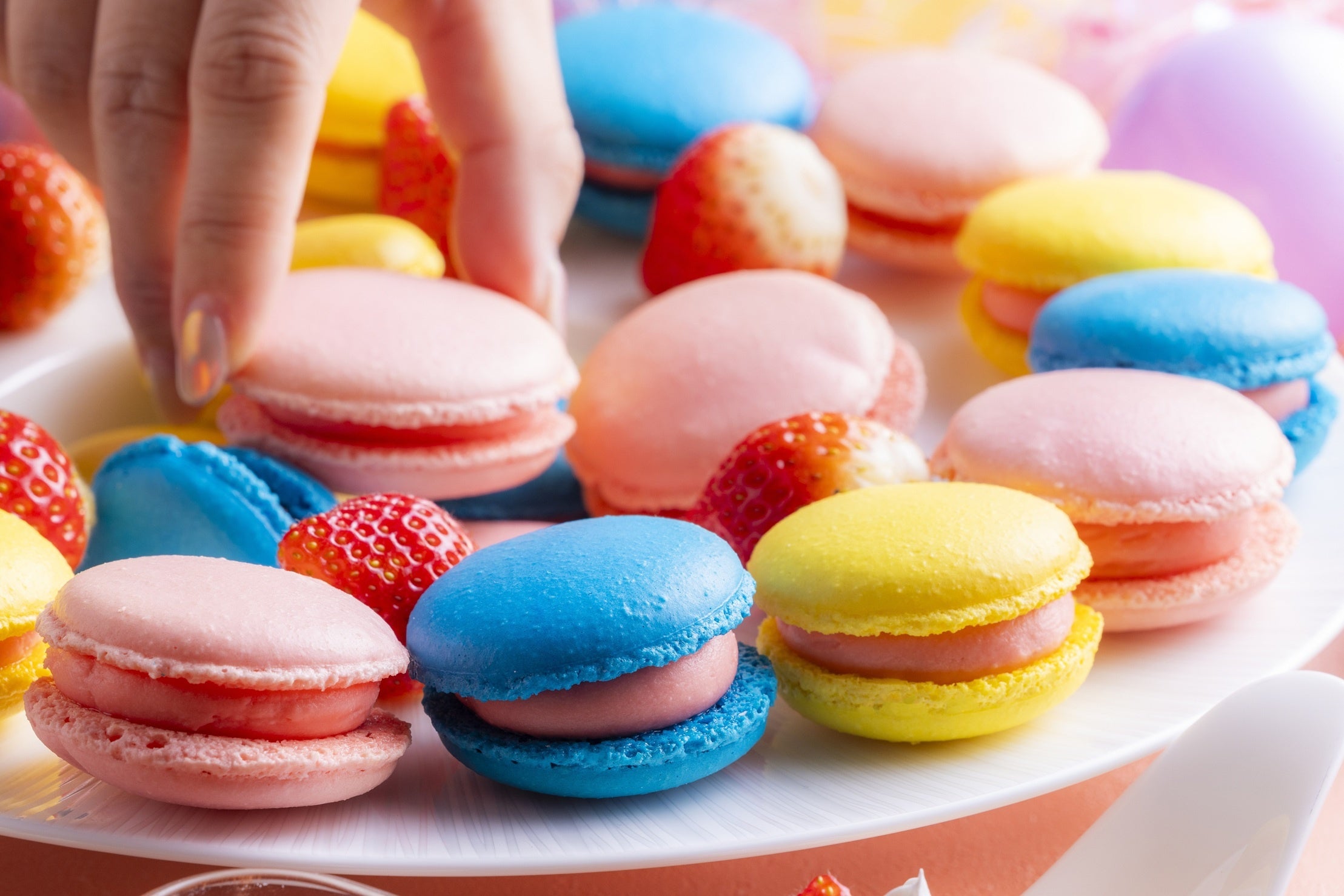 スイーツでひと際目を引くカラフルな「いちごのトゥンカロン」は、フレッシュいちごを挟んでおり、その可愛らしさは写真映え間違いなし。サクサクのクッキー生地にたっぷりのいちごを乗せた「ロングストロベリータルト」は、口いっぱいに広がるいちごを味わっていただけます。さらに、ライブステーションで仕上げる「いちごカスタードの絞りたてパイシュークリーム(ランチ限定)」は、美味しさだけではなく、オーダーしてから出来上がるまでのワクワク感も楽しみの一つです。