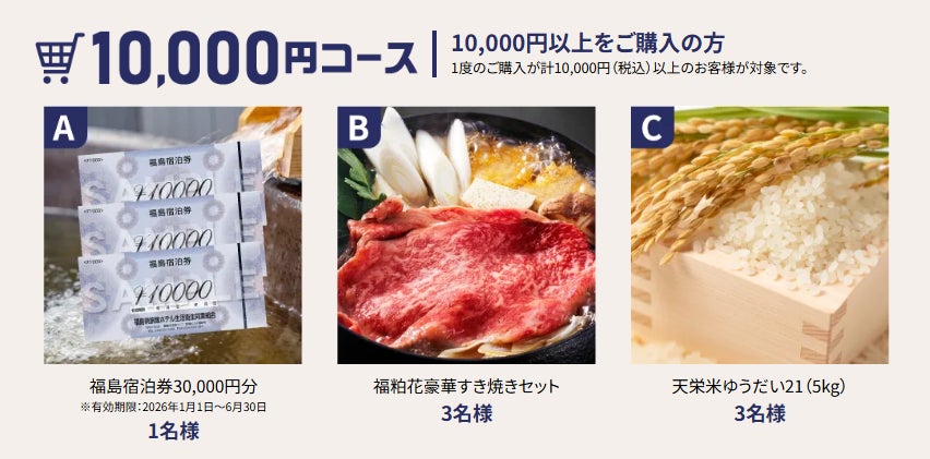 ふくしま市場で、キャンペーン期間中に一度のご購入が計3,000円/5,000円/10,000円以上の方に、当店よりお送りする該当コースの応募フォームからご応募ください。