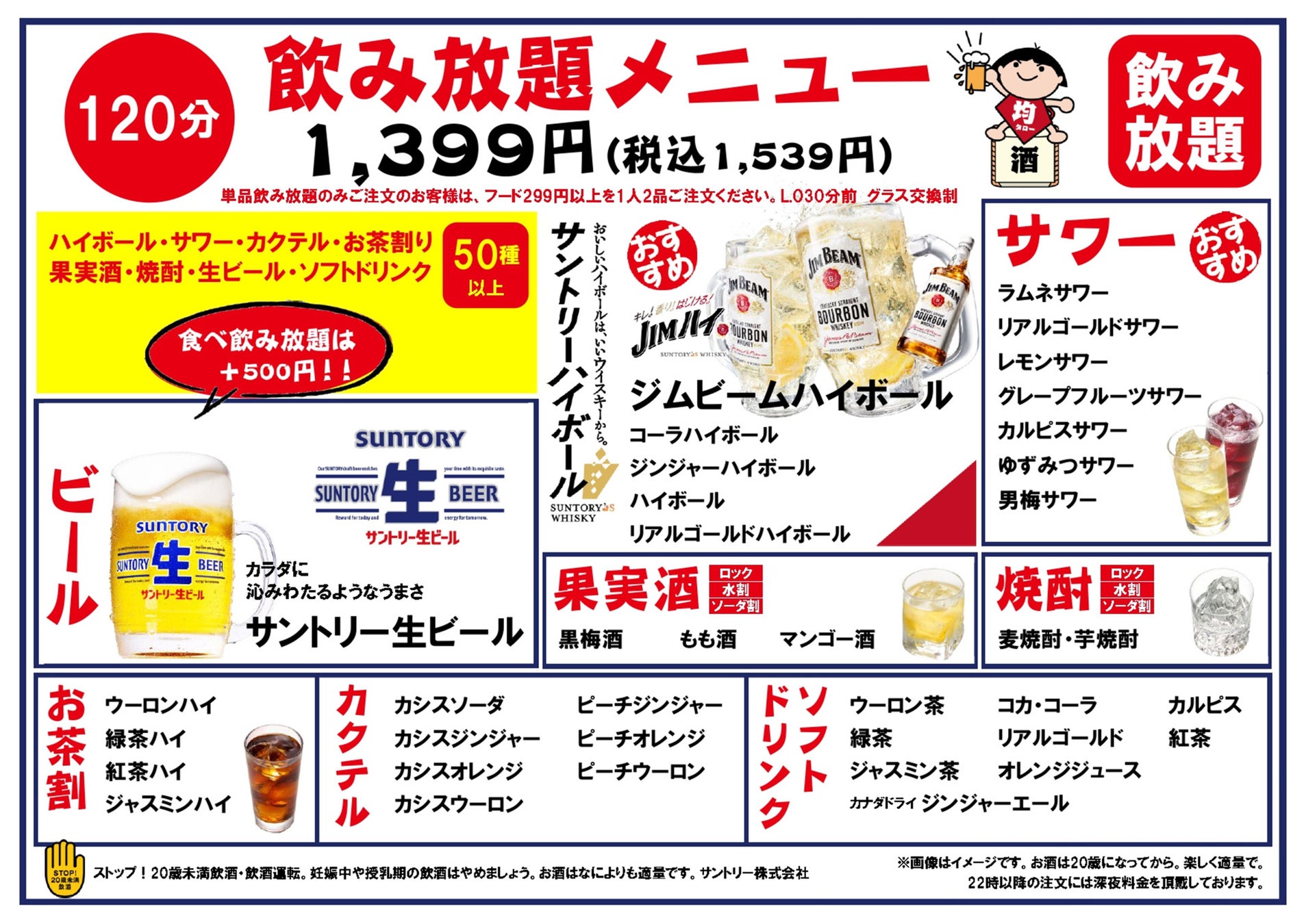 均タローで食べ飲み放題クリパを楽しもう(予約不要・当日注文OK)