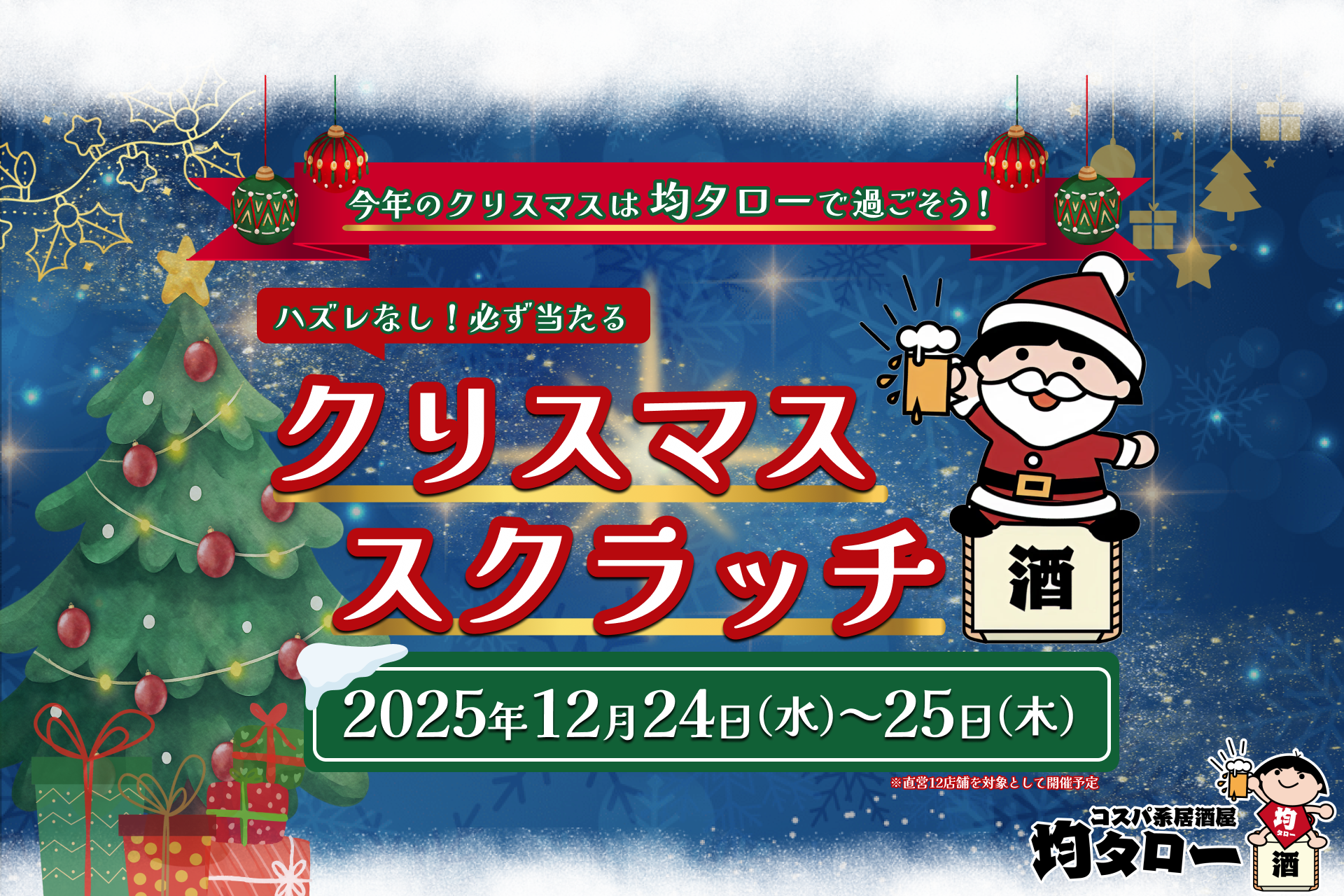 株式会社ジュネストリー(本社:東京都大田区、代表取締役:東明 遼)が運営するコスパ系居酒屋・均タローの直営店にて、「必ず当たるクリスマス★スクラッチイベント」を2025年12月24日(水)および25日(木)に開催します。