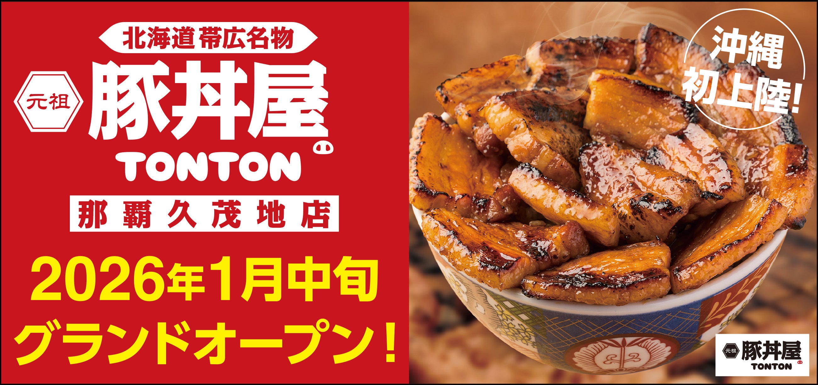 ワンズトライン株式会社(本社:大阪市北区芝田2丁目3番16号、代表取締役:山内仁)は、沖縄県那覇市に沖縄初上陸となる「元祖豚丼屋TONTON 那覇久茂地店」(住所:沖縄県那覇市久茂地1-8-1)を、’26年1月中旬オープンいたします。