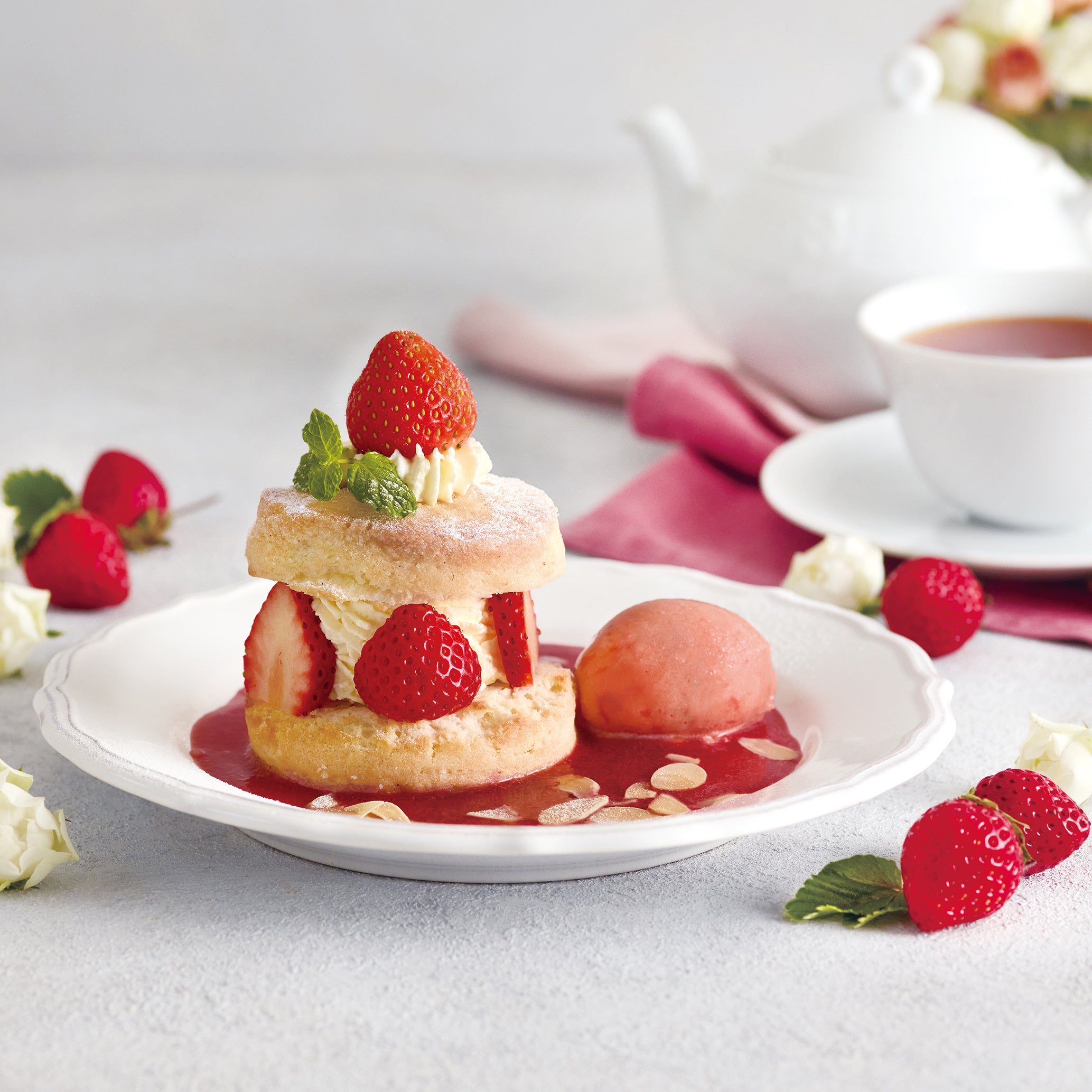 バニラビーンズ入りのさっくりふわっと食感のスコーンにフレッシュ苺、レモンミルクホイップをサンドしました。ストロベリージェラート、甘酸っぱい苺のソースとともに。