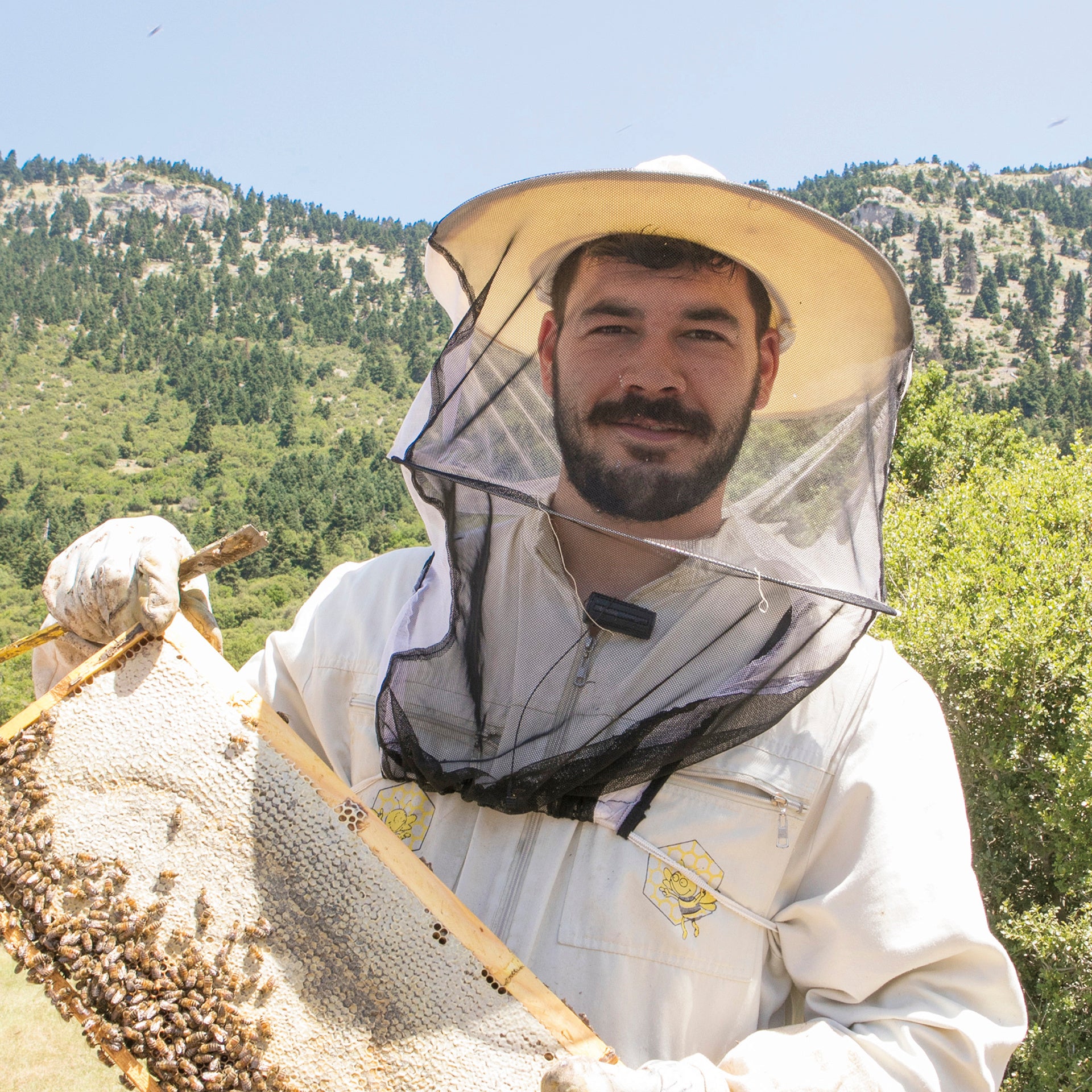 養蜂家一家の三代目。1960 年に祖父が始めた養蜂を受け継ぎ、現在は三代目としてその歩みを継いでいます。まだ30 代と若いですが、3 歳から養蜂を手伝っているので30 年近いキャリアのある養蜂家です。スーカス一家はキャロブの他にもクリスマスツリー、オレンジ、タイム、オーク、ヒースなど10 種類以上のはちみつを収穫しています。養蜂場はギリシャのペロポネソス半島にある標高2,355 メートルのヘルモス山にあり、その壮大な景観と豊かな生態系を守るため「ヘルモス=ヴライコス国立公園」に指定されています。