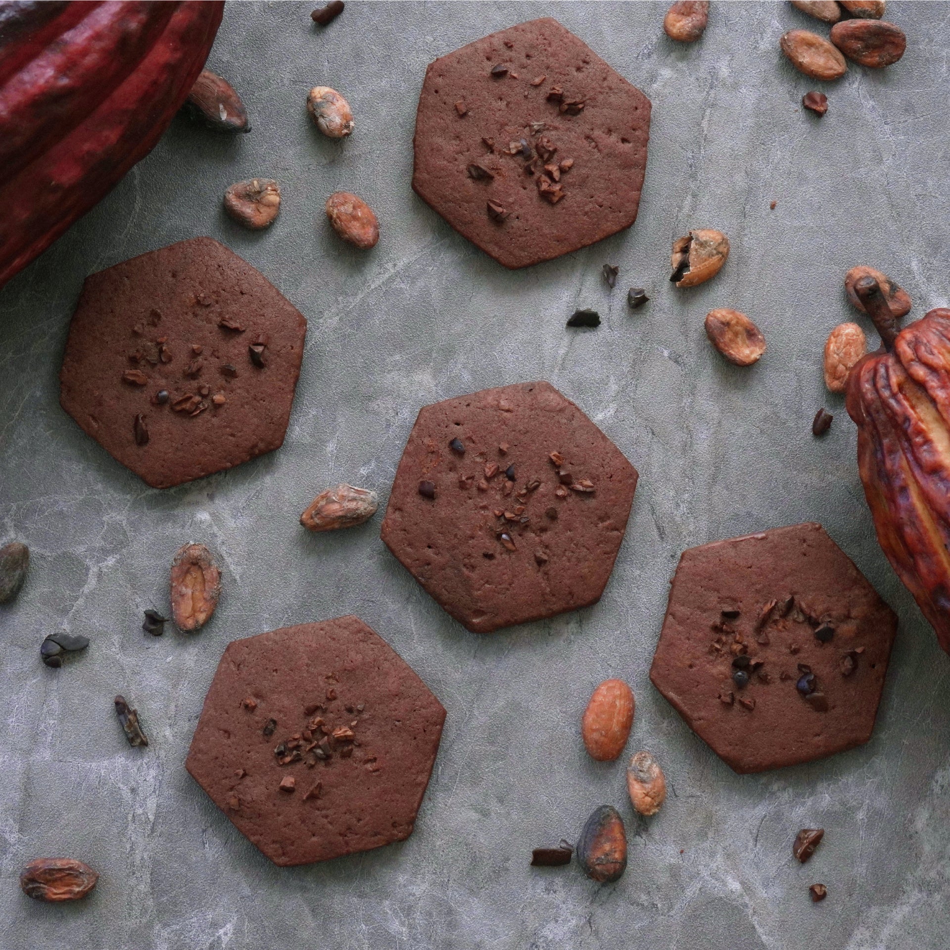 ■商品説明:ペルー産のカカオを皮ごと砕き、芳醇なアロマを閉じ込めた濃厚サブレ。はちみつの優しい甘みがリッチな余韻を広げます。