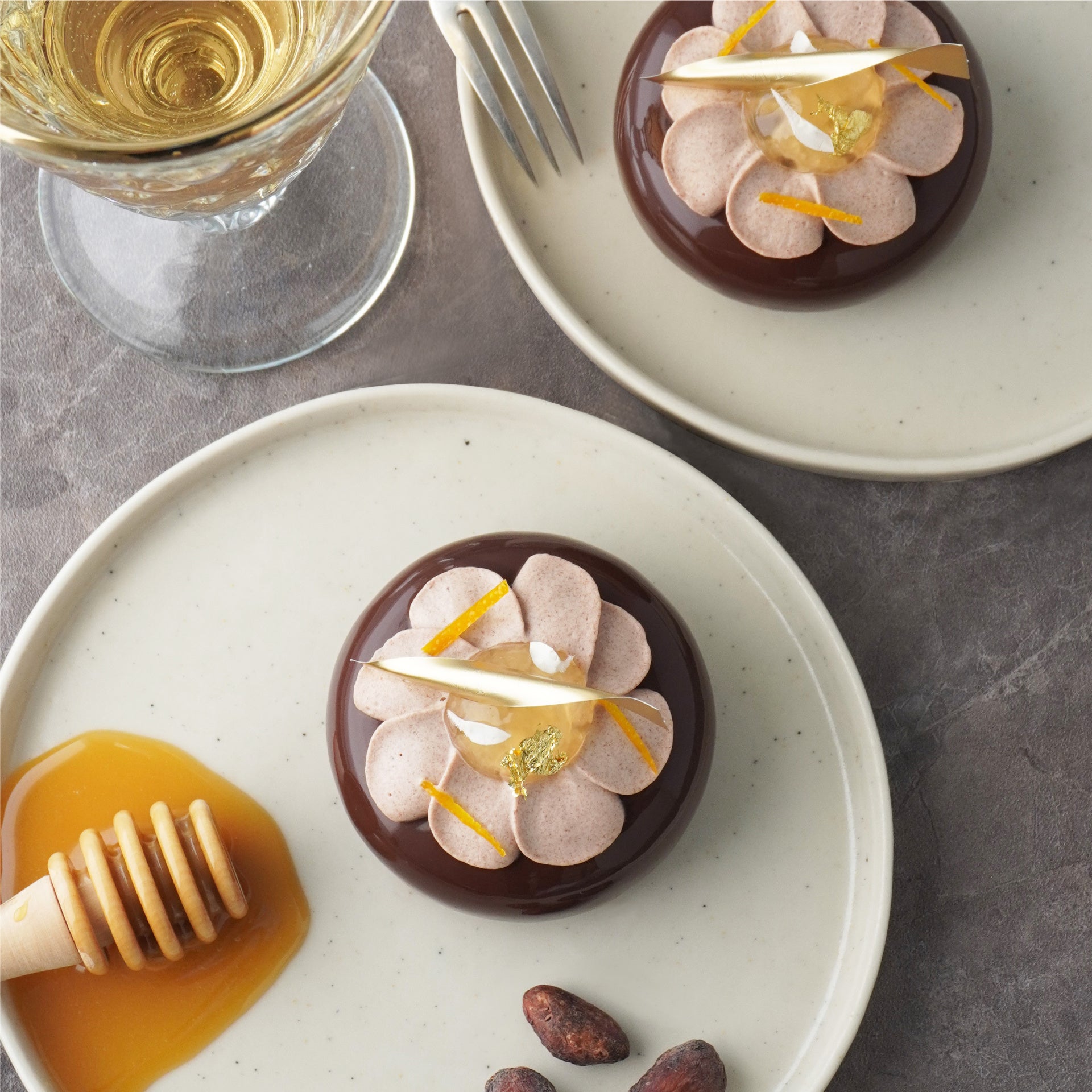 ひまわりはちみつ×ピウラカカオの香りに合わせて、2 種のオレンジピューレとピールを贅沢に重ねたパートドフリュイが口いっぱいに広がる深く華やかな果実感。