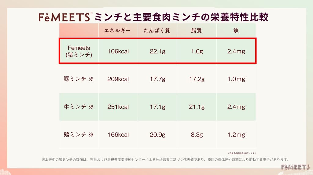 さらに、選定した部位から脂身を除去し、赤身肉を中心に使用することで、脂質を抑えながら鉄およびたんぱく質を摂取しやすい商品設計としています。これにより、鉄ケアを目的とする層に加え、脂質やエネルギー摂取を意識する層にも適した選択肢を提供します。