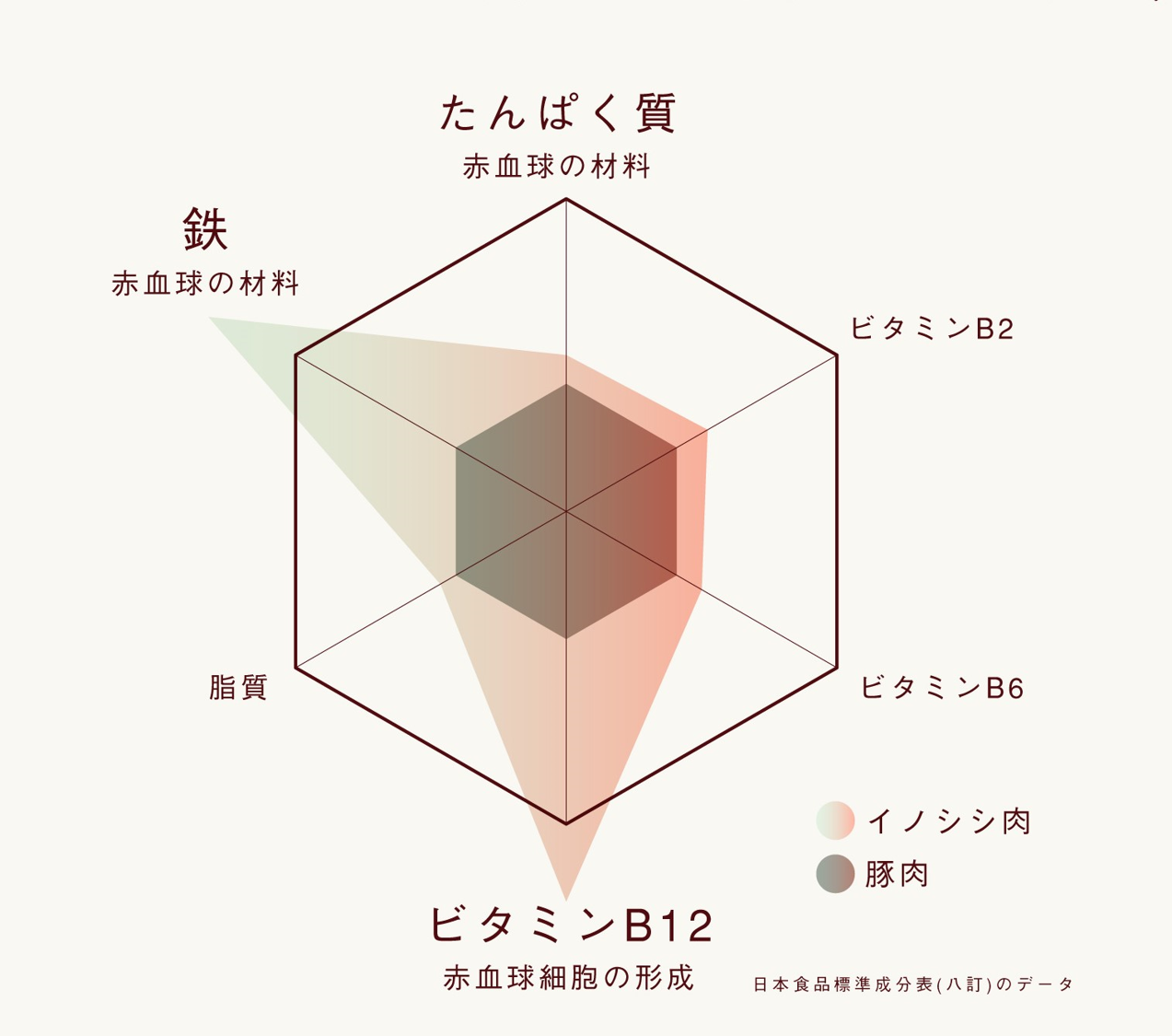 猪肉は、豚肉と比較して鉄やたんぱく質、ビタミンB群などを含む食材として、広く知られています(図1)