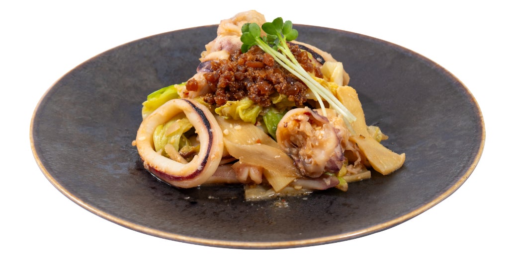 本取り組みでは、五戸水産が製造する商品を使用し、当社で特別メニュー「イカの味噌麹炒め〜ピリ辛イカラー油がけ〜」を開発しました。震災後も水産物の流通が十分に回復していない現状を受け、単発ではなく、今後も数か月に1回のペースで継続的にメニュー提供を行う予定です。