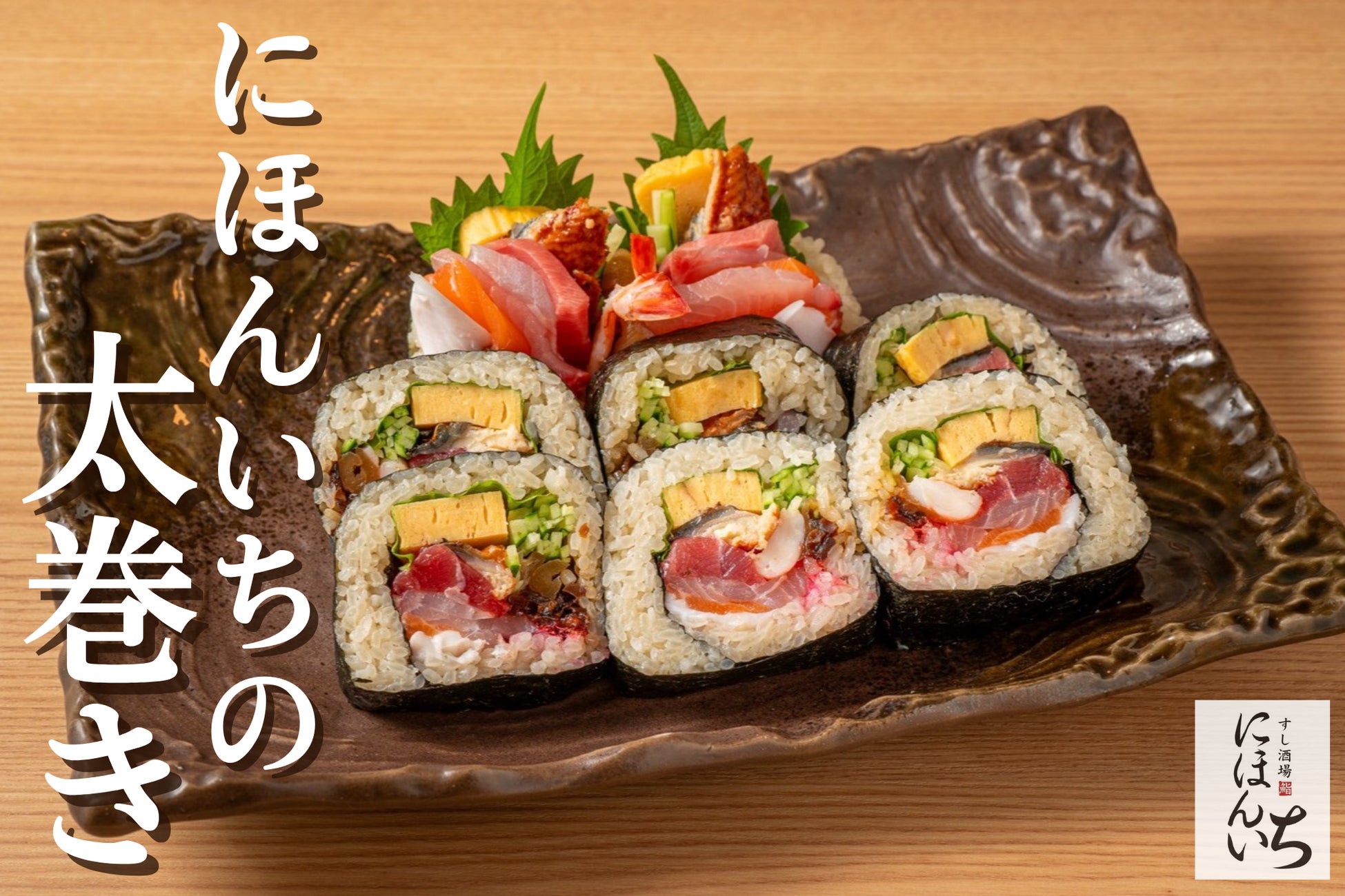 太巻きには12種類以上の具材を惜しみなく使い、断面の迫力と味の一体感を追求しました。まぐろ、白身、穴子、えび、玉子焼き、きゅうり、野菜など、多彩な素材が何層にも重なり、どこを食べても違う美味しさが広がります。にほんいち本町店を象徴する一本です。