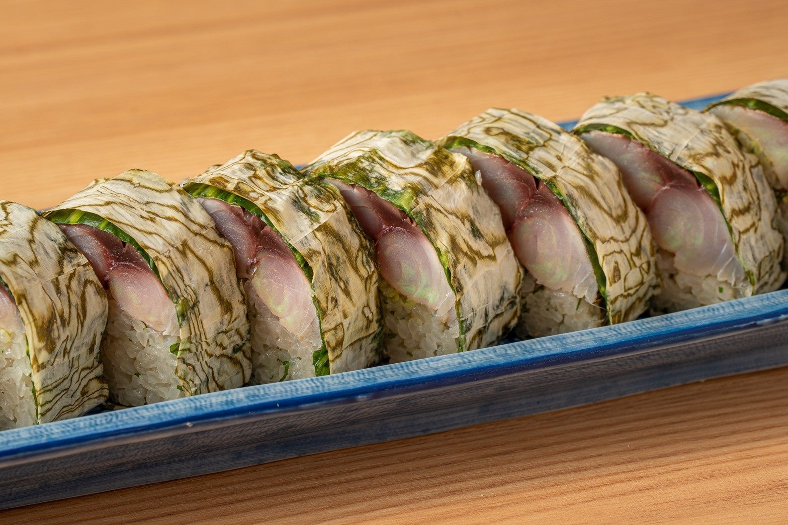 サバ棒寿司を軽く炙り、香ばしさを引き立てた一品。高菜で包んだのち、さらにおぼろ昆布をまとわせることで、酸味・旨み・香りの絶妙なバランスが生まれました。にほんいちらしい遊び心を加えた、ここでしか味わえないオリジナルの味わいです。