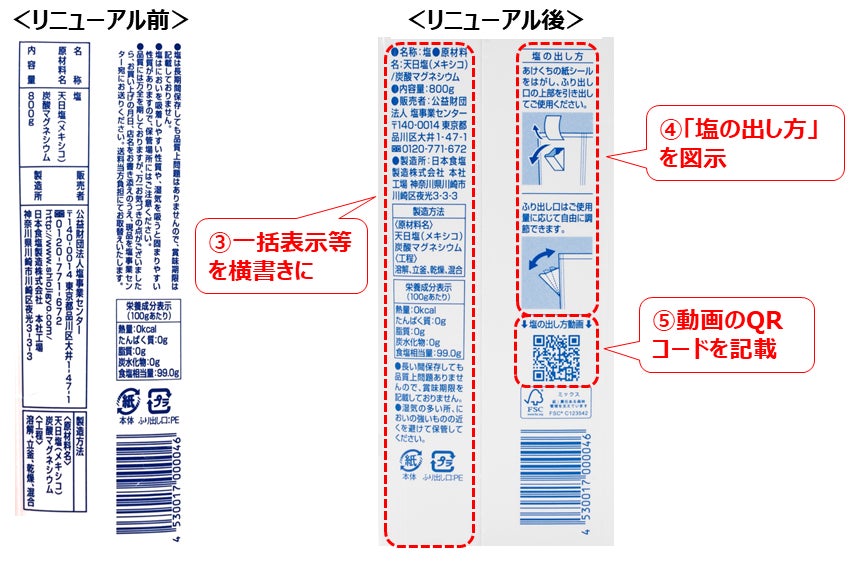 パッケージ背面では、③一括表示、製造方法、賞味期限・保管場所を横書きに変更して読みやすくし、④「塩の出し方」として開け方・使い方を図解入りで説明し、⑤あわせて開け方・使い方動画のQRコードを記載しました。