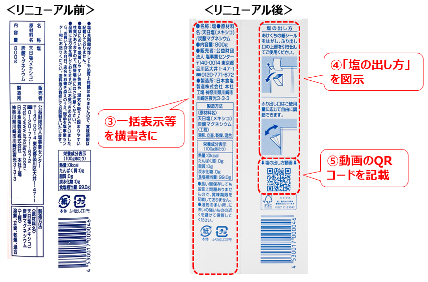 パッケージ背面では、③一括表示、製造方法、賞味期限・保管場所を横書きに変更して読みやすくし、④「塩の出し方」として開け方・使い方を図解入りで説明し、⑤あわせて開け方・使い方動画のQRコードを記載しました。