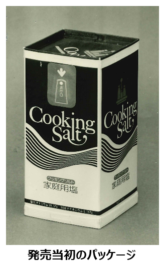 昭和51(1976)年に、当時の日本専売公社から発売されました。当時はポリ袋、紙袋入りの商品が主流のなか、片手でも持てる取り回しの良さ、振り出し量を調節できるくちばしなどでご好評をいただき、日本の台所、飲食店等で長年親しまれているロングセラー商品※です。平成12(2000)年にデザインをリニューアル、紺色の箱型から、白色で容器の下部をスリム化して丸みを持たせた現行のデザインになりました。