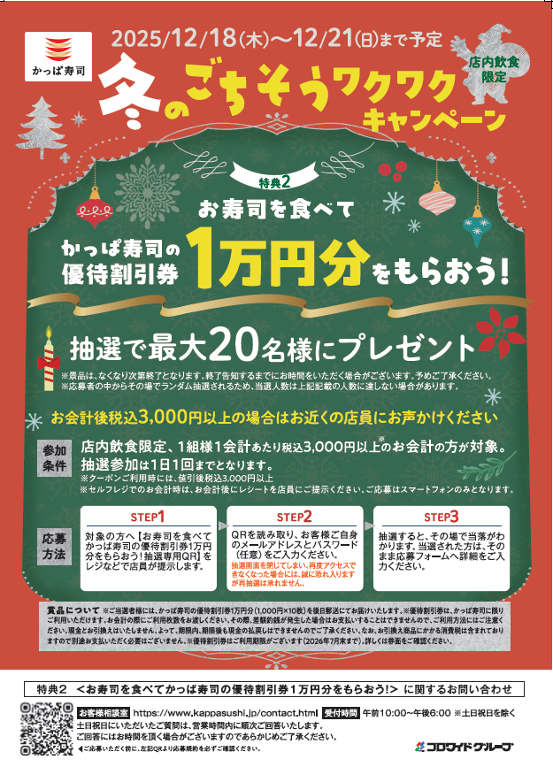 ・内容:店内飲食限定で1組様1会計あたり税込3,000円以上のお会計の方を対象に、抽選で最大20名様に1万円分のかっぱ寿司の優待割引券をプレゼント
