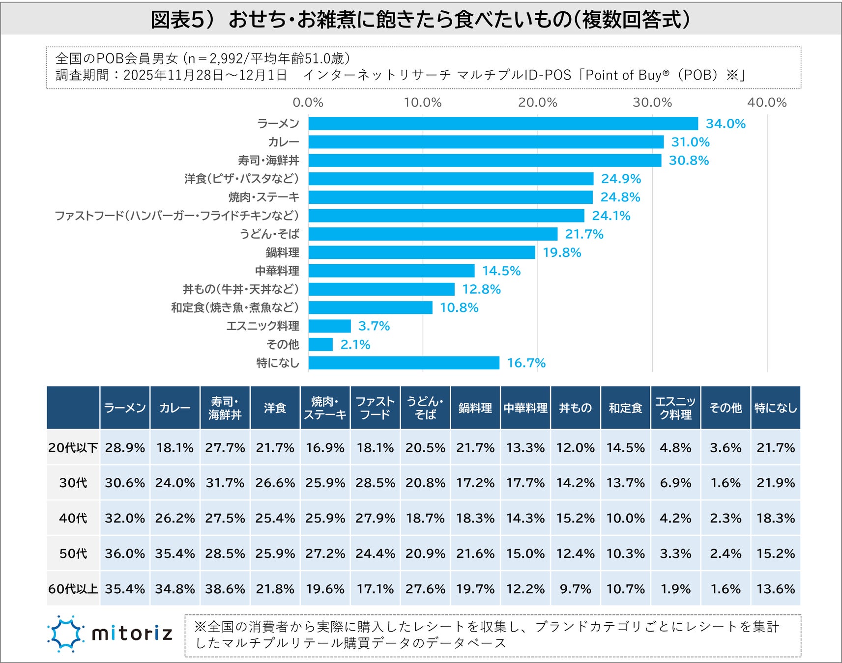 おせちに飽きたら食べたいものはラーメンが34.0%、次いでカレーが31.0%
