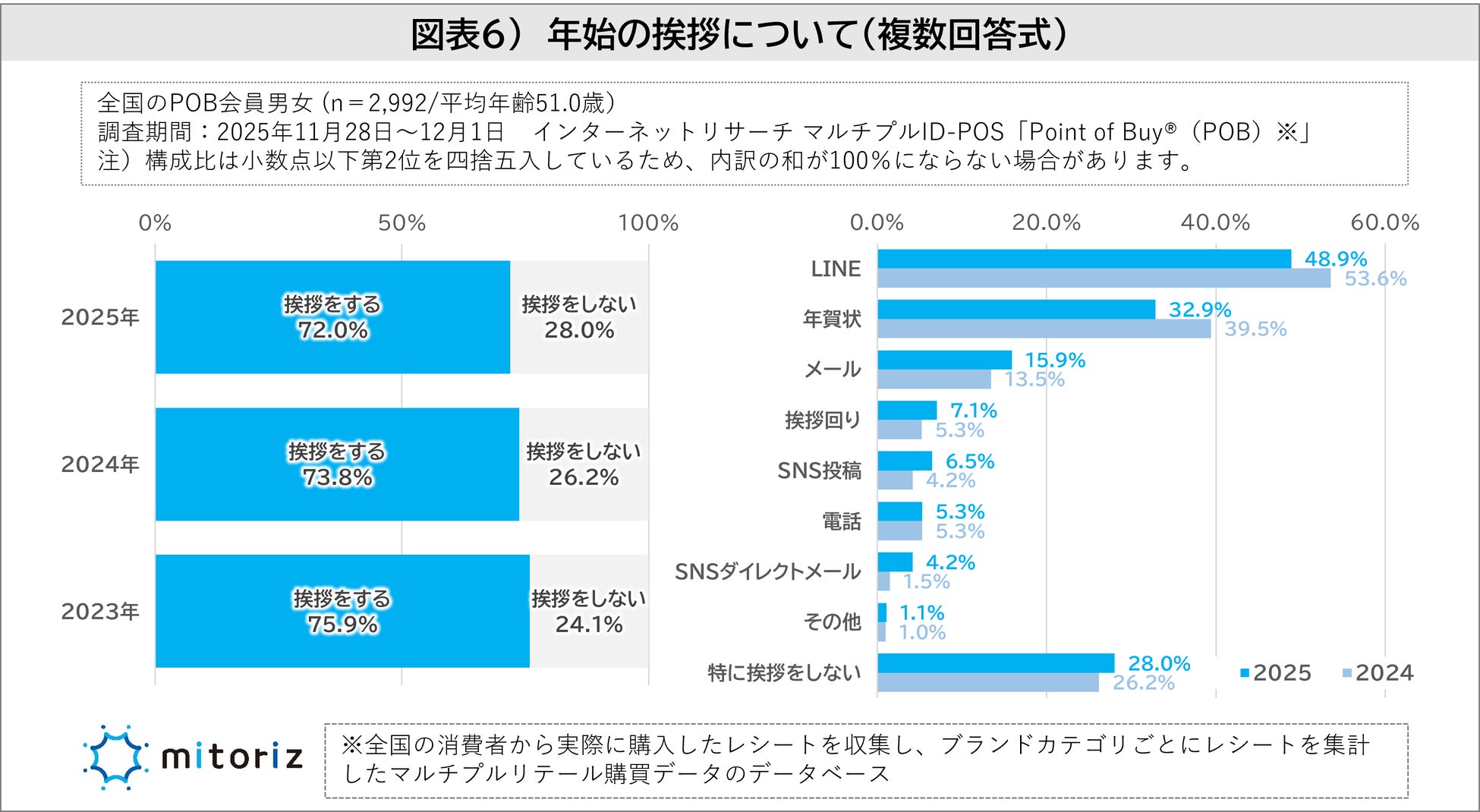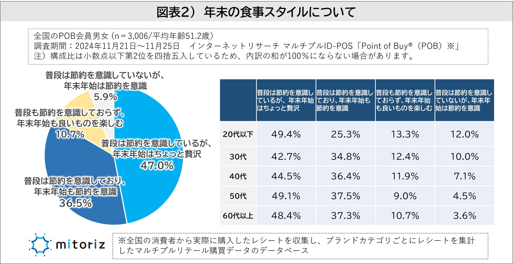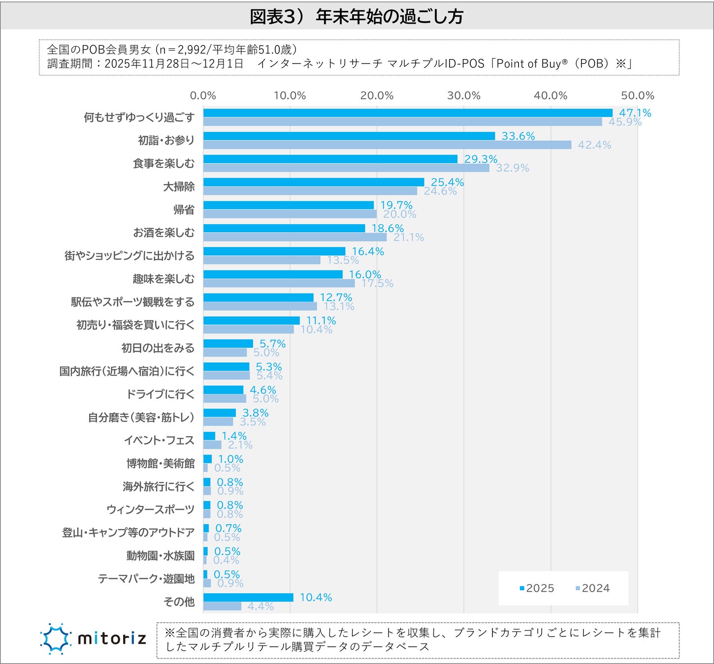 株式会社mitoriz(本社:東京都港区、代表取締役社長:原田光幸)は、消費者購買行動データサービス「Point of Buy®(以下、POB)」の会員2,992人を対象に「年末年始の過ごし方に関する調査」を実施しました。