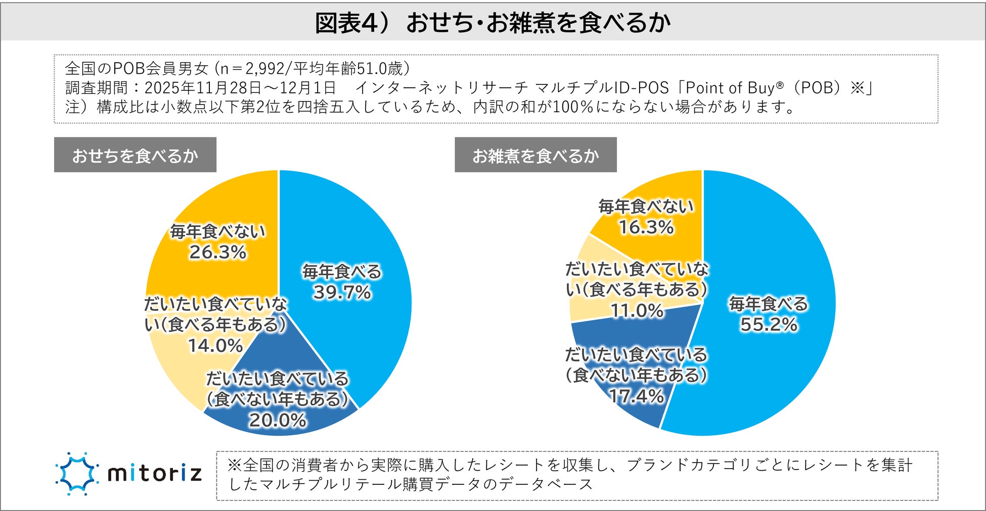 一方、お雑煮は「毎年食べる」(55.2%)に「だいたい食べている(食べない年もある)」(17.4%)を加えると、あわせて72.6%が“食べる派”となりました。おせちよりも「毎年食べるもの」として定着しており、多くの家庭で親しまれていることがわかります(図表4)。