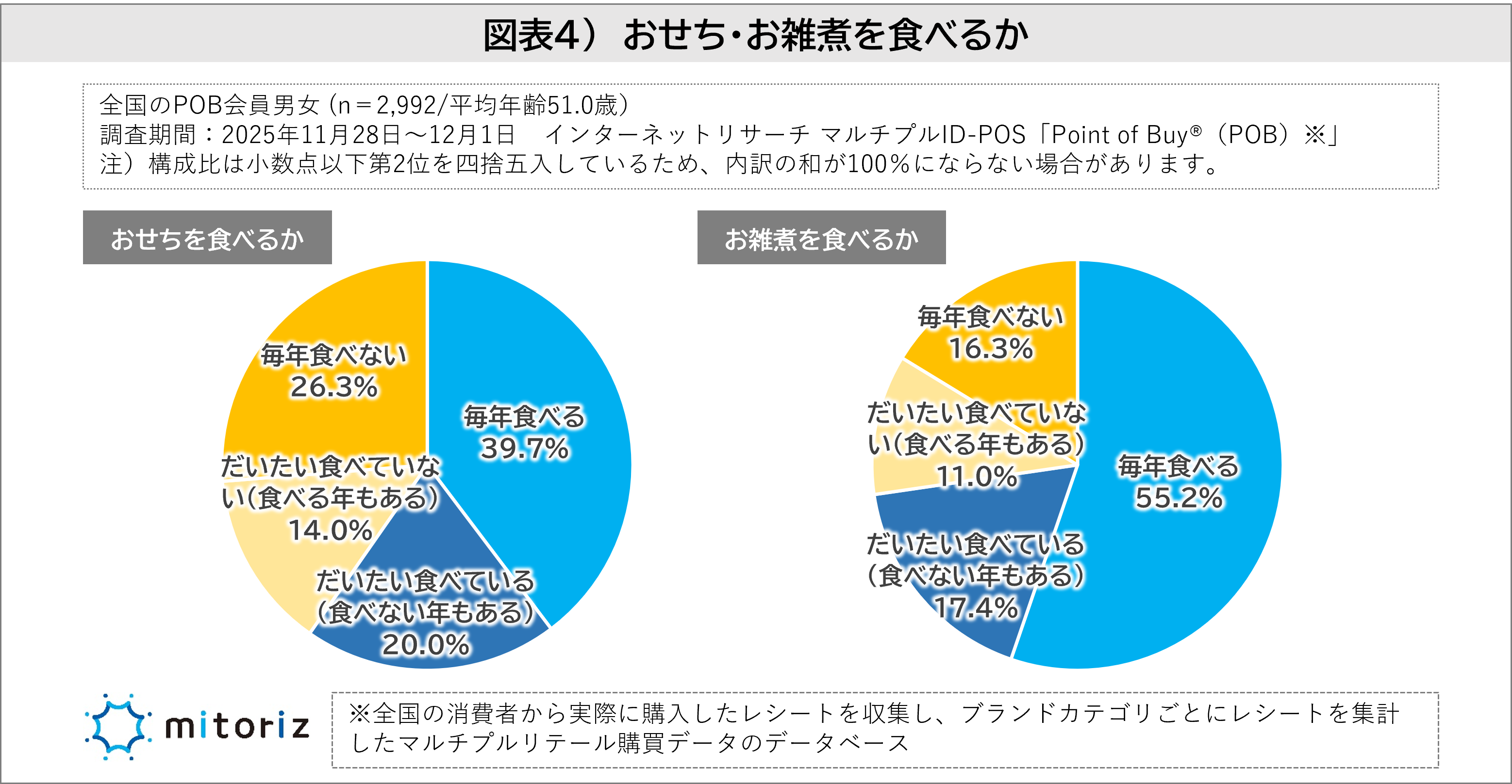一方、お雑煮は「毎年食べる」(55.2%)に「だいたい食べている(食べない年もある)」(17.4%)を加えると、あわせて72.6%が“食べる派”となりました。おせちよりも「毎年食べるもの」として定着しており、多くの家庭で親しまれていることがわかります(図表4)。