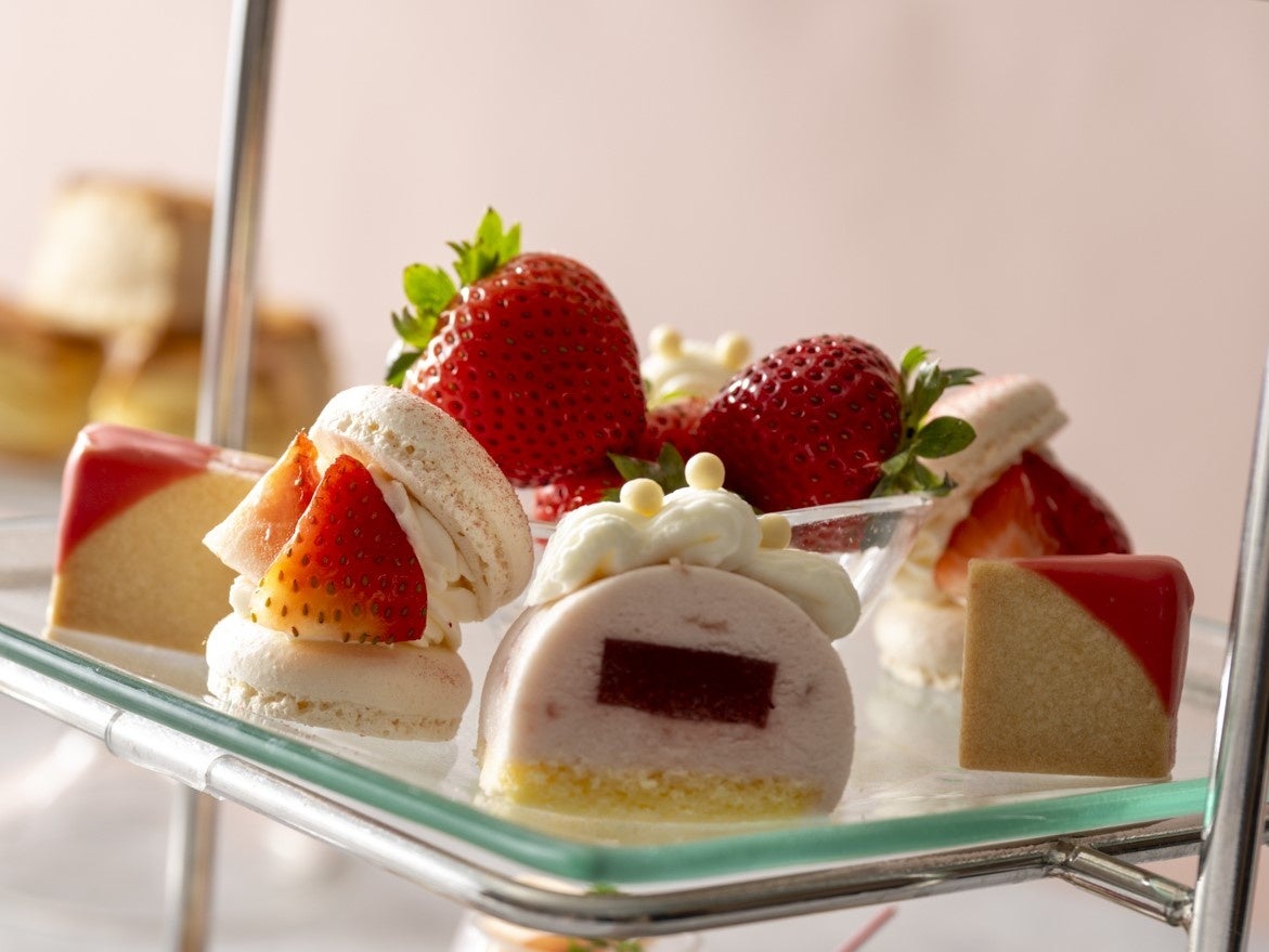 ホテルの外観をかたどったティースタンドの最上段では、フランスで“春を告げるケーキ”として有名な「いちごのフレジェ」の美しい断面が目を引きます。カスタードとバタークリームをあわせた濃厚なフレジェクリームがいちごの瑞々しい甘さを引き立たせ、優しいハーモニーを奏でる一品です。そのほか、濃縮したミルクの豊かな風味にライムが香るいちごゼリーを重ねた「いちごとミルクのムースケーキ」や、杏仁豆腐といちごのソースにサクサクしたフィアンティーヌがグラスの中で層をなす「いちごの杏仁パフェ」など、赤とピンクの彩りが愛らしいスイーツをお楽しみいただけます。