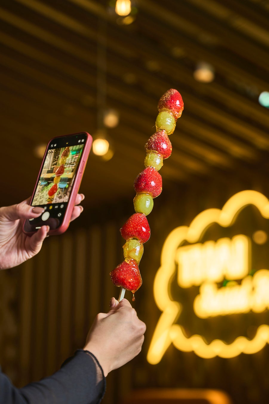 SNS映え必至のフォトジェニックな40㎝ものいちご&マスカット飴「プレミアム・ストロベリー・スティック」がランチビュッフェ限定で新登場!上品な甘さのマスカットとあまおう苺を贅沢にサンドし、ペストリーシェフ自家製の飴でコーティングした見た目も味もインパクト十分な1品です。ジューシーなフルーツが口の中いっぱいに広がり、気づけば一人でぺろりと完食できるほど、軽やかな味わいです。ぜひ見て、食べて、写真に撮って、SNSに投稿してお楽しみください。