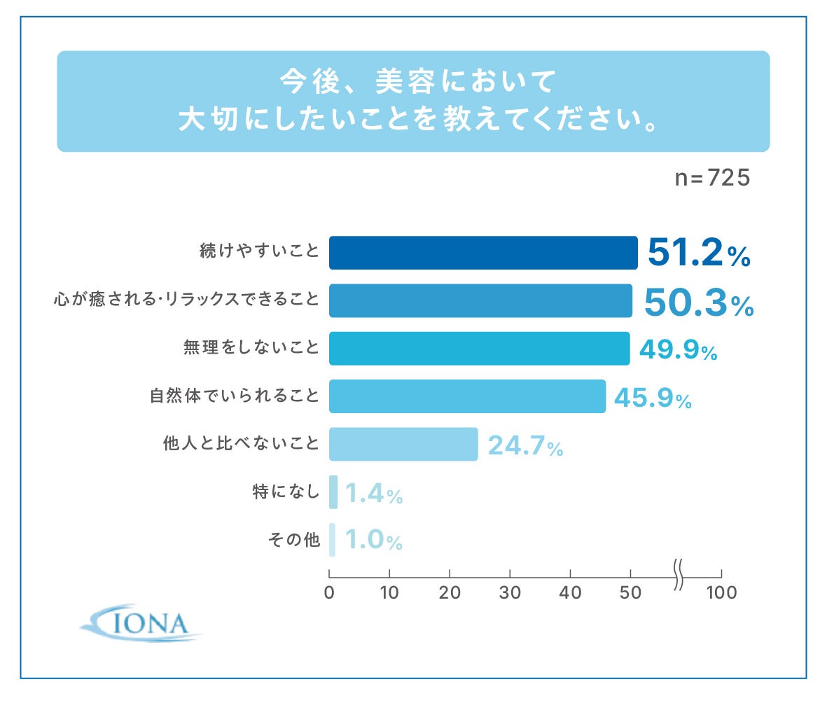 加えて、今後大切にしたい価値として「続けやすい」「無理をしない」「心が癒される」が上位に。こうした結果から、現代女性の美容は“成果のための行為”から“心を癒す行為”へとシフトしつつあることが伺えます。