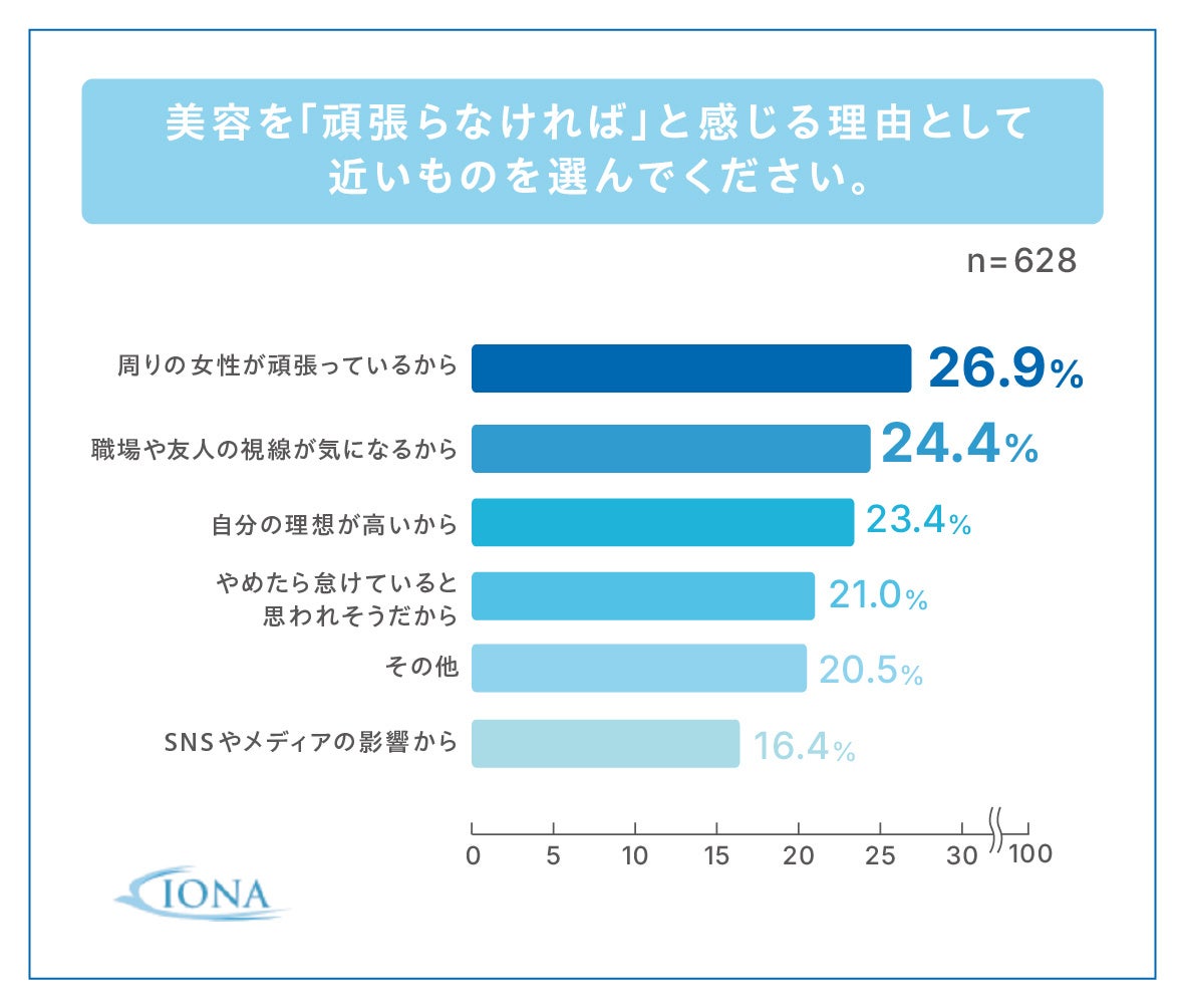 「美容を頑張らなければ」と感じる理由として、周囲の女性の頑張り、理想の高さ、SNSやメディアの影響、職場や友人の視線などが挙げられました。
