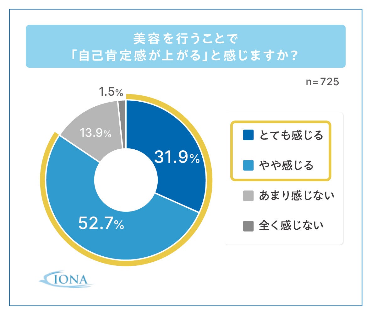 美容を行う理由は「自己肯定感を上げたい」「好きな自分でいたい」が中心で約3割半ずつ。美容で自己肯定感を「とても感じる/やや感じる」と答えた女性は約8割。