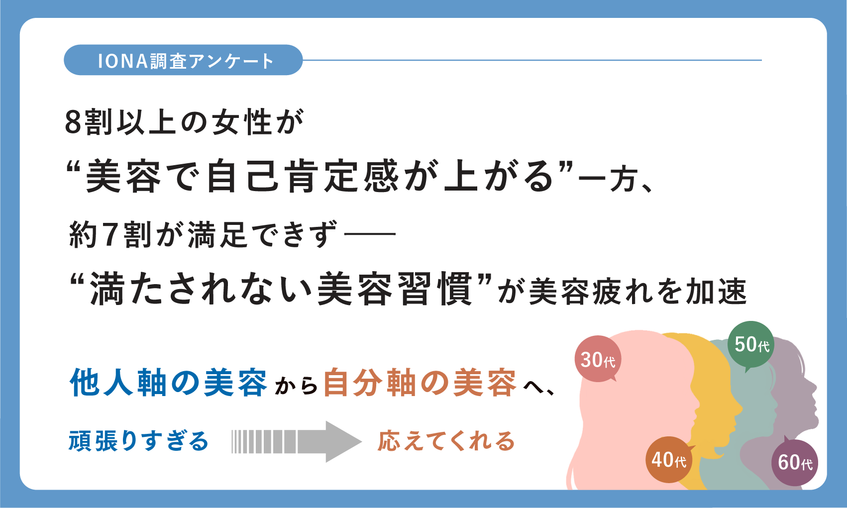 手摘み“天然”つばめの巣によるインナーケア美容ブランド「RIA RASA(リアラーサ)」を展開する株式会社IONA(本社:大阪府大阪市、代表取締役:成田圭子)は、30~59歳女性983名を対象に「美容疲れに関する調査」を実施しました。調査の結果、8割以上の女性が「美容をすると自己肯定感が上がる」と回答する一方で、約7割が現在の美容に「満足できていない」と感じており、“満たされない美容習慣”が美容疲れを加速させている可能性が明らかになりました。