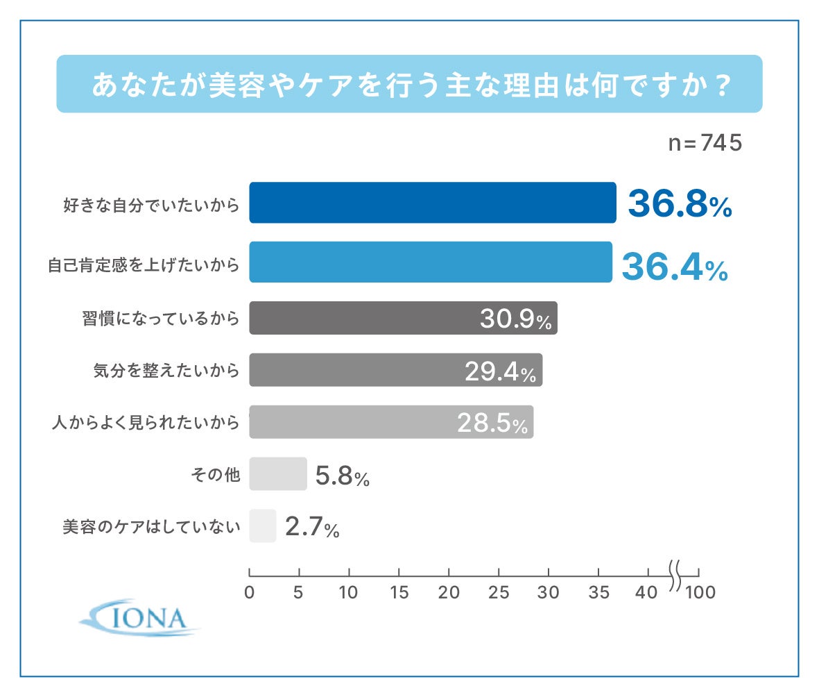 美容を行う理由は「自己肯定感を上げたい」「好きな自分でいたい」が中心で約3割半ずつ。美容で自己肯定感を「とても感じる/やや感じる」と答えた女性は約8割。
