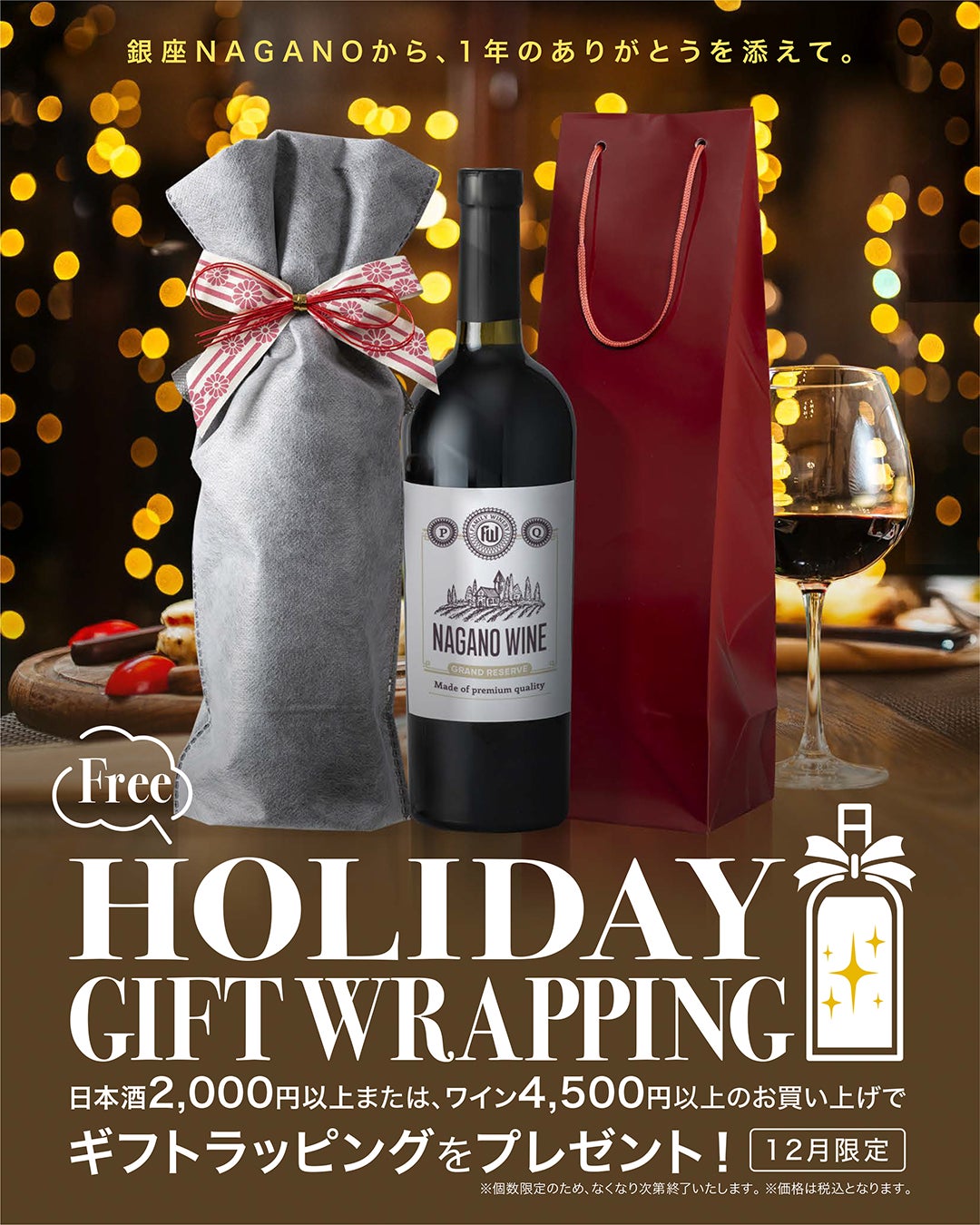 一定額以上の日本酒またはワインをご購入いただいたお客様に、銀座NAGANOから1年の感謝を込めて、ギフトラッピングを無料でプレゼント。幅広いシーンでのギフトに対応できるよう、長野県らしい水引飾りをあしらったリボンや、ワインレッドの袋でデコレーションいたします。今年の大切な人へのホリデーギフトには、長野県らしいお酒を選んでみてはいかがでしょうか。