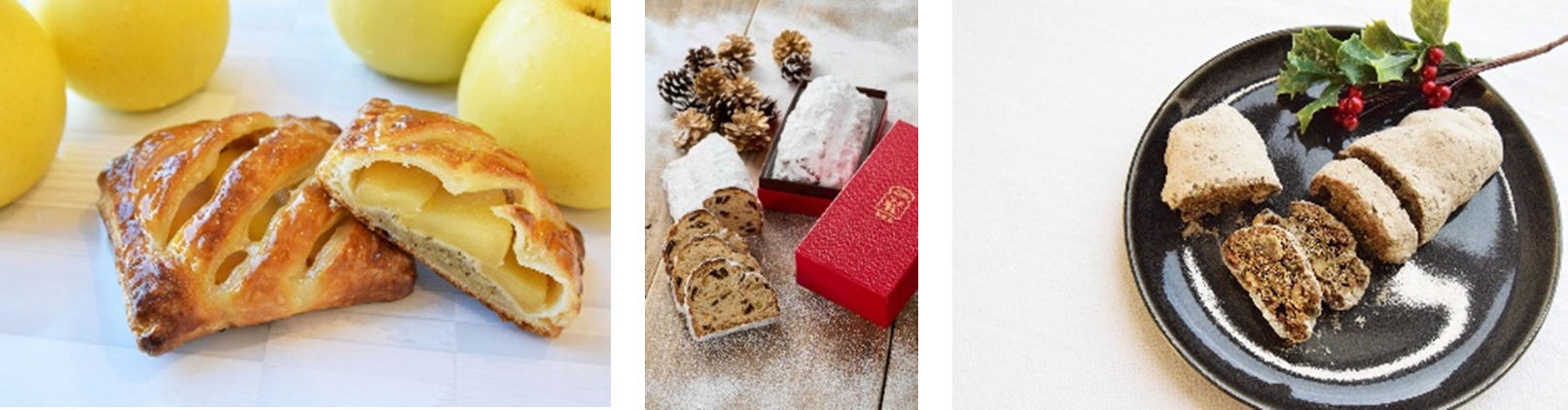 「ブランジェ浅野屋」の代表スイーツの一つでもある、ドライフルーツをふんだんに加えたドイツ伝統のクリスマス菓子『浅野屋クリストシュトレン』や、ほうじ茶生地にオレンジピール、マカダミアナッツ、丹波の黒豆、ほうじ茶チョコ、マロングラッセを練りこんだ『ほうじ茶スティックシュトレン』、さらに長野県産の黄色りんごを贅沢に使った『信州産食べごろりんごのアップルパイ(シナノゴールド)』などをワンプレートに盛り付けた、冬の信州の魅力を楽しみ尽くすことのできるここでしか味わえない一皿です。