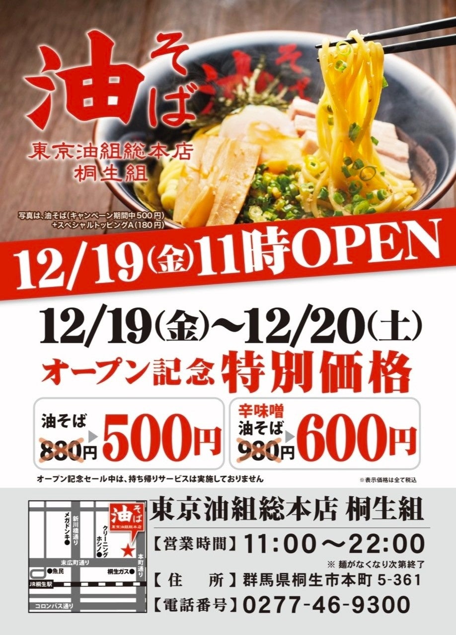 『東京油組総本店 桐生組』の出店を記念し、2025年12月19日(金)・ 20日(土)の2日間、「油そば」 と 「辛味噌油そば」 を特別価格でご提供いたします!(東京油組総本店 桐生組のみで実施)