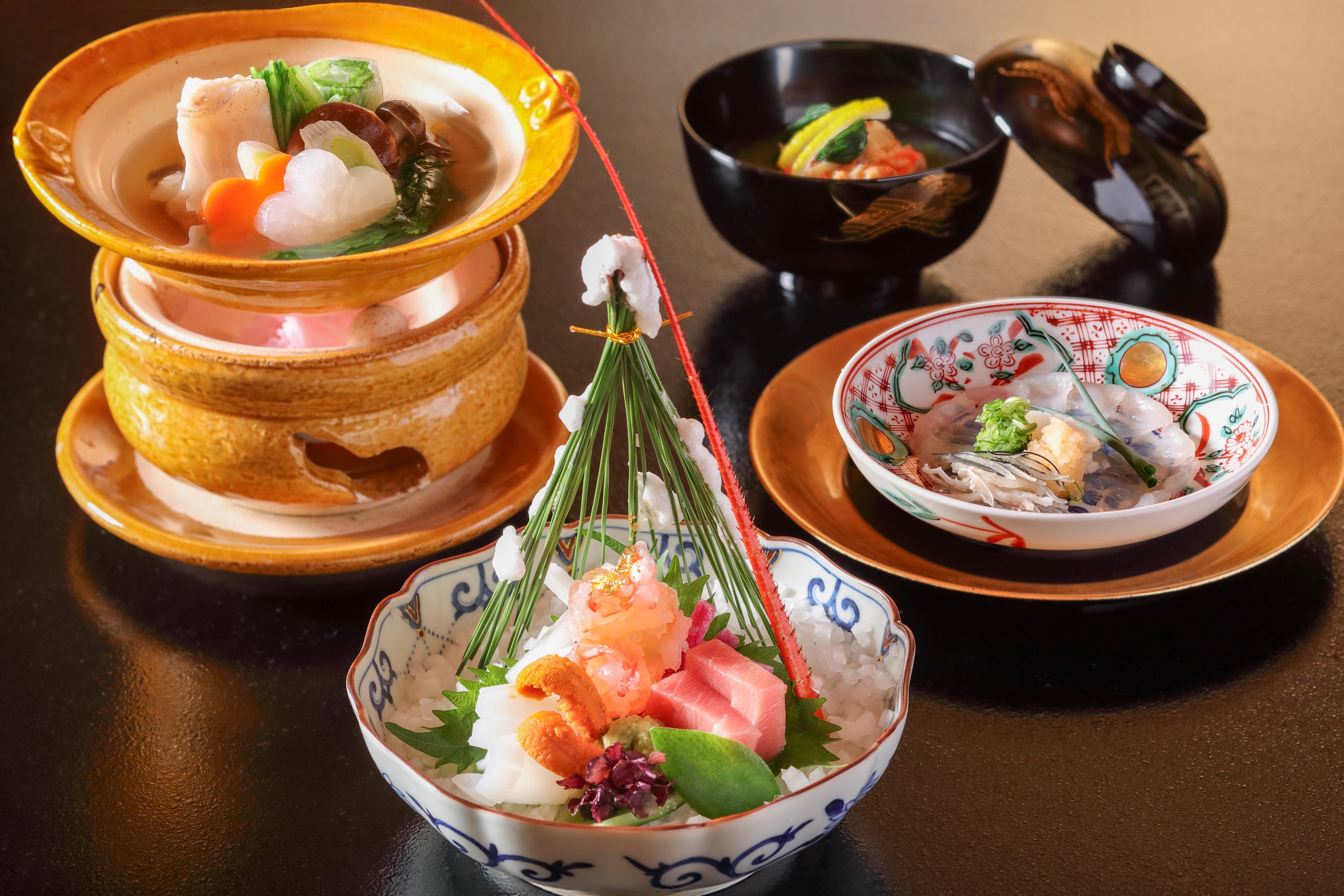 「黄綬褒章」や「現代の名工」など数々の受賞歴をもつ日本料理 うえまち 料理長 茅ヶ迫 正治が、冬の味覚の代表 ふぐ・クエ・蟹などを使用したワンランク上の会席を、2日間限定でご用意します。熟練の技が光る盛り付けと、繊細なお料理をご堪能ください。また、お料理に合う地酒のペアリングもご用意していますので、会席と合わせてお楽しみいただけます。