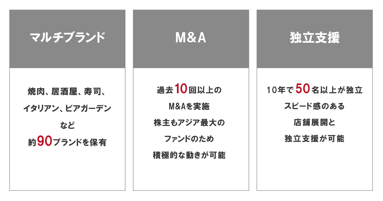過去10件以上のM&A経験とアジア最大級のファンドPAGの資金力を有するGYRO HOLDINGSでは、今後も積極的にM&Aを検討していく考えです。そのため、「食で未来を創る」という当社の理念や考えに共感し、共に未来を切り拓ける可能性のある企業を常に募っております。引き続き、そば・うどん・とんかつ・焼肉・ハンバーグ・郊外型レストラン等、幅広いジャンルをグループに迎え入れ、日本の素晴らしい食を世界に届けられる飲食企業をグループ一丸となり目指してまいります。