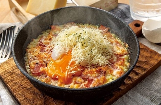 「神戸元町ドリア」では、「ドリアの専門店」として常時 30 種類以上のドリアメニューを販売しております。「2種ソースのドリア」は神戸元町ドリアの人気商品「カルボナーラ風ドリア」と「BMTドリア(ベーコン・もち・トマト)」をハーフ&ハーフ仕立てで仕上げました。濃厚クリームのカルボナーラと、程よい酸味のトマトソースの2つの味を一度に楽しめる商品です。