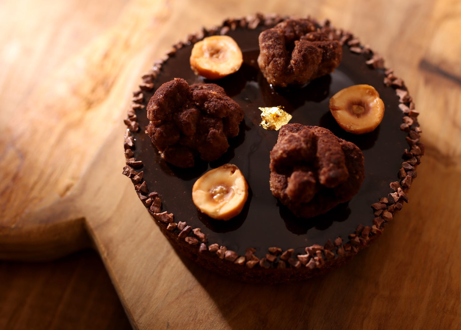 コニャック V.S.O.P. の風味が広がる濃厚なショコラ生地に、ショコラのグラサージュとシュトロイゼル、香ばしいヘーゼルナッツを飾り、アクセントにカカオニブを添えました。ショコラ好きに贈る濃厚で贅沢な味わいです。