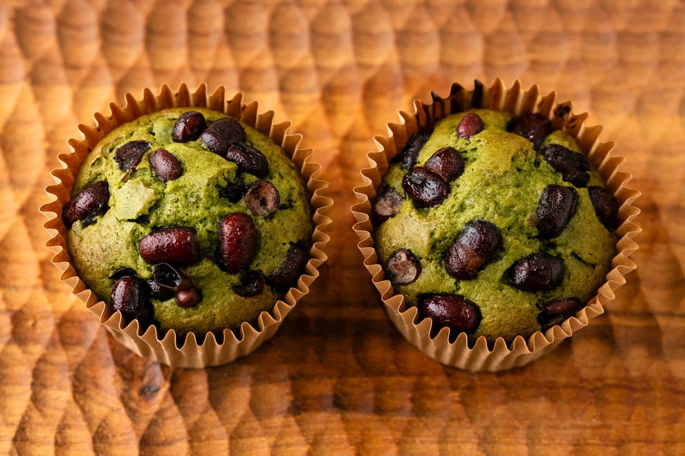 能登大納言をたっぷりと混ぜ込み、蜂蜜を加えてしっとり焼き上げた抹茶マフィン。