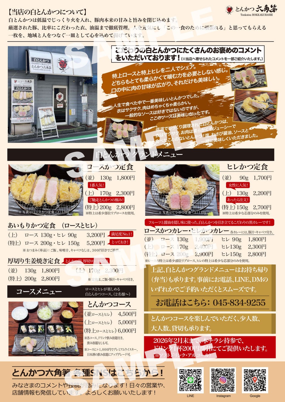 横浜市神奈川区の六角橋エリアに根付く白とんかつ専門店「とんかつ六角箸(ろっかくはし)」(本社:神奈川県横浜市、株式会社開物成務 代表者 田中 朋行(たなか ともゆき))は、この度、期間限定でお客様還元イベントと称し「2025年12月23日〜25日 歳の瀬三日間&新年のお振る舞いイベント」を開催いたします。2025年3月より、白とんかつ専門店としてリニューアルオープンし、地域の皆様や、たくさんのお客様に支えていただき、今年を無事に乗り越え、来年度も元気に営業をスタートしていけることに感謝をし、六角箸の自慢の「白とんかつ」を少しでも多くの方へお届けしたいと考え企画し、開催することとなりました。また、年始2026年1月4日〜11日の期間は、通常11,500円分として使える「プレミアムパス」を9,000円で販売!ロースかつ定食やヒレかつ定食を思う存分お楽しみいただけます。試行錯誤を重ねてたどり着いた、見た目も美しい低温調理のご馳走「白とんかつ」の贅沢な味わいを是非ご堪能ください!