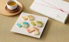 1897年に京都で創業した貸衣裳店の4代目とパティシェ夫婦が手掛ける“纏う”をテーマにした菓子店「京纏菓子cacoto」。円満と調和の吉祥紋として親しまれる「七宝」、未来永劫への願いを込めた「青海波」、亀の甲羅に似ていることから長寿を願う「亀甲花菱」、子供の成長を願って産着にも多く使用される「麻の葉」の4種類の詰め合わせです。