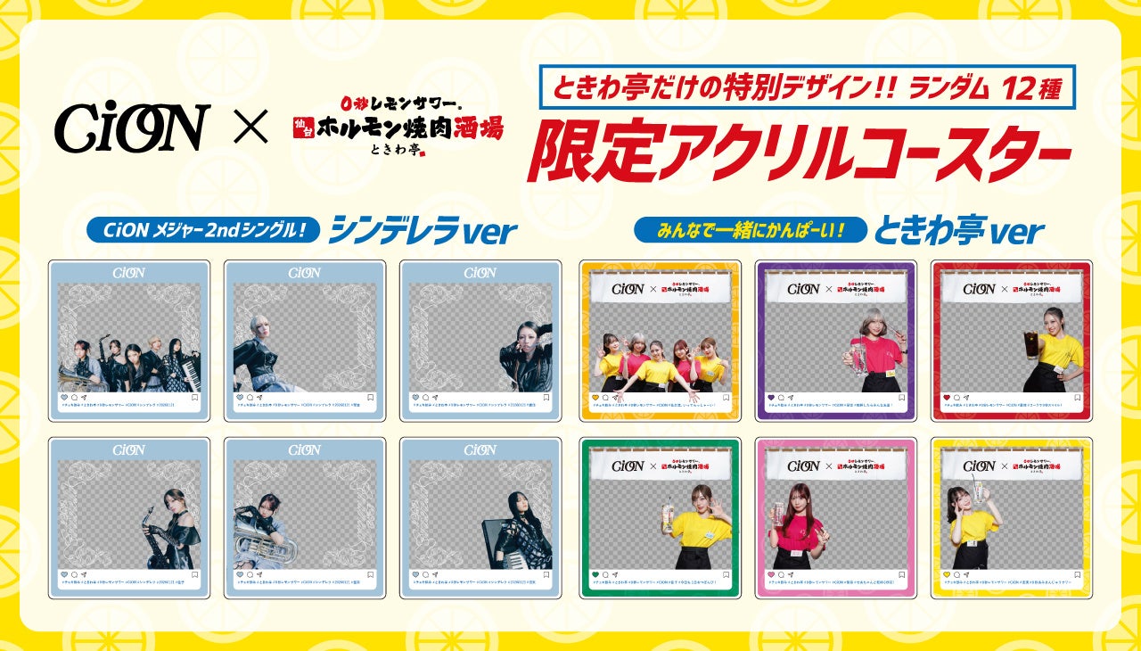 ときわ亭では、人気上昇中の5人組ガールズユニット『CiON』のメジャー2ndシングル「シンデレラ」発売に合わせ、「0秒レモンサワー® 仙台ホルモン焼肉酒場 ときわ亭」4店舗限定でコラボキャンペーンを開催します。