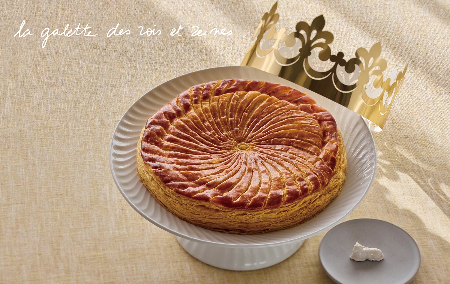 ガレット・デ・ロワは、折り込みパイ生地にアーモンドクリームを詰め、表面に美しい飾り包丁「レイエ」を施した新年のお祝い菓子です。カットした中にしのばせた 「フェーヴ」 と呼ばれる小さな陶器のオブジェに当たった人は、その日一日紙製の王冠を被って「王様」として祝福され、幸運な一年を過ごせると言われています。キリスト教の祝日・公現祭(1月6日)に食べるのがフランスでの習わしですが、現在では1月の間じゅう楽しめるお菓子として、フランス国内、また日本でも広く親しまれています。今回は「王様」(Rois / ロワ) だけでなく「女王様」(Reines / レーヌ)」もお楽しみいただける「ガレット・デ・ロワ & デ・レーヌ」として販売。アニエスベーらしさを名前にも込めました。