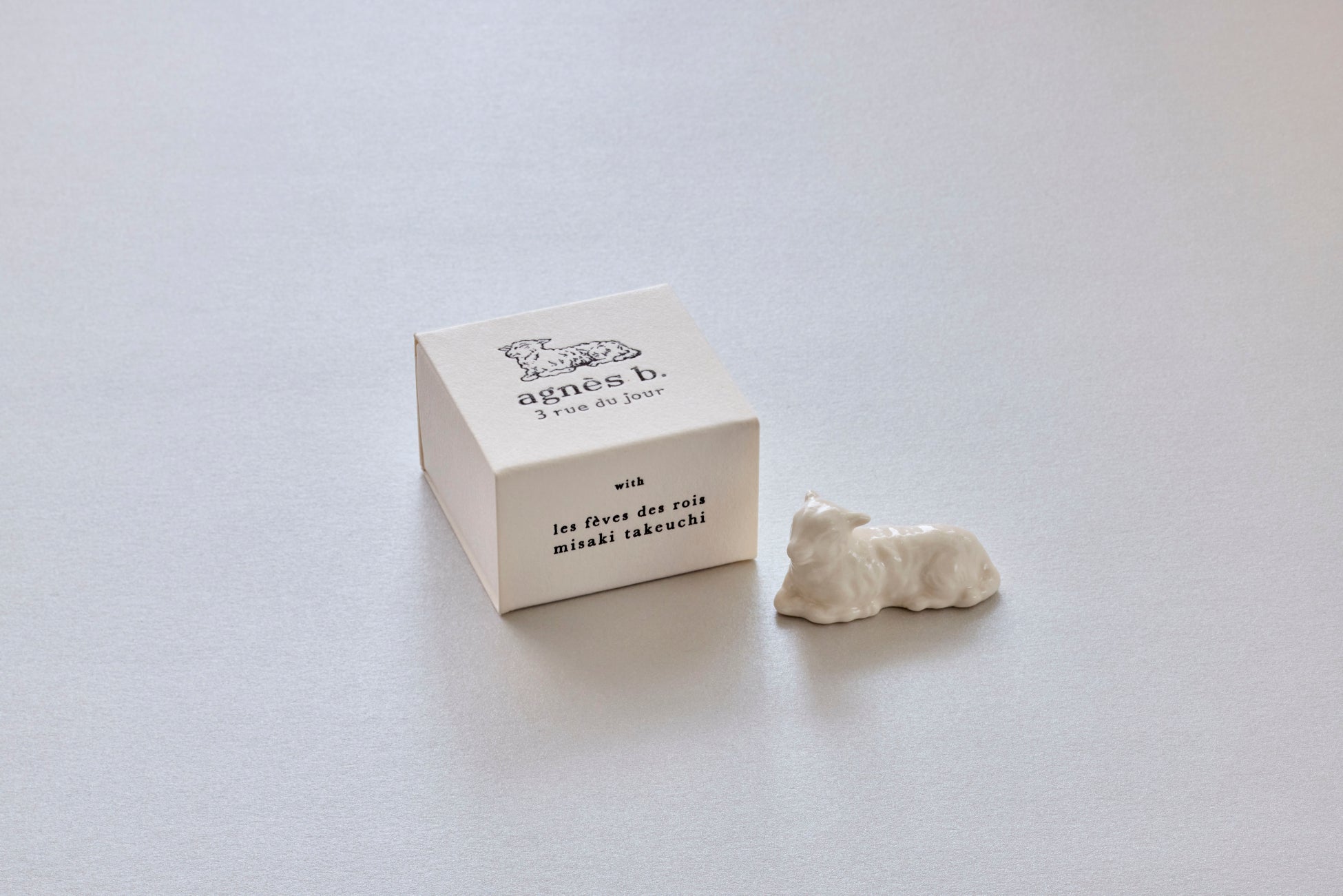 「ガレット・デ・ロワ & デ・レーヌ」は、フェーヴ作家・misaki takeuchiさんが制作した子羊のフェーヴと紙製クラウンを添えて販売します。子羊はフランス語でアニョー(Agneau)といい、幼い頃のアニエス・トゥルブレが名前(Agnès)をもじって「アニョー」と呼ばれていたことに由来。アニエスべーのパリの1号店の看板のロゴにも描かれ、アニエスのクリエイションの原点を象徴しています。また、クラウンは同じくmisaki takeuchiさんが1964年のフランス映画『シェルブールの雨傘』に登場する王冠にインスピレーションを得てデザイン。